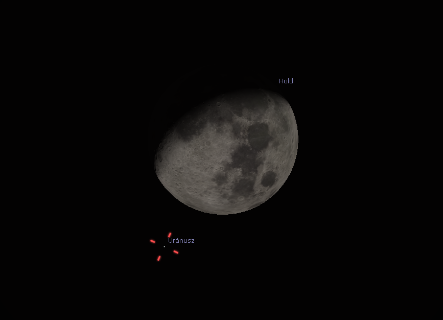 Fedés most nem lesz, de közelség igen. Az 5,7 magnitúdós Uránusz maximális hold-közelítésére éjfél után 16 perccel kerül sor, ekkor 19 ívperccel délre látszik majd a Holdtól. Egy kézitávcsővel már jól megfigyelhető lesz a fényes Hold alatt bujkáló, egészen halványnak tűnő Uránusz.