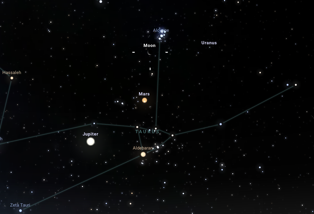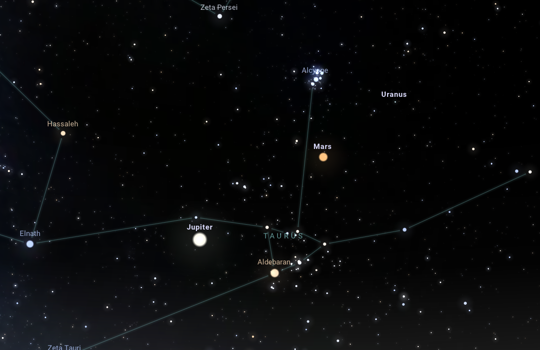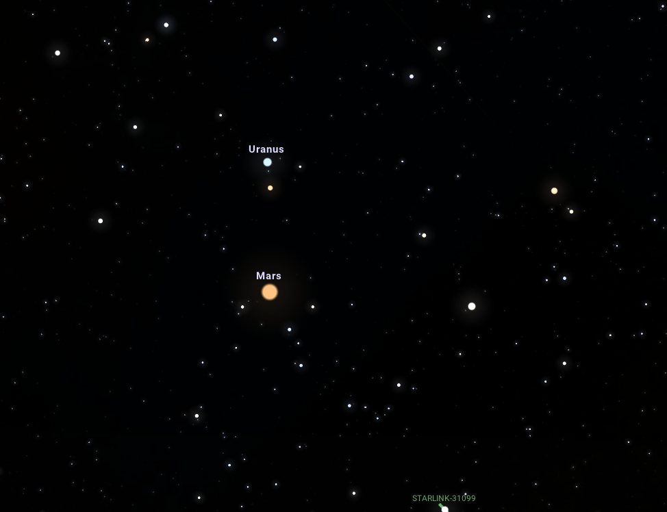 Aki szereti a forró nyári éjszakákat, és véletlenül fennmarad július 16-án hajnali 3 óráig, mindenképp nézze meg az Uránusz és a Mars együttállását a keleti égbolton. A Mars szabad szemmel is látható 0,9 magnitúdós látszó fényességével, vöröses színével pedig kiviláglik a körülötte lévő csillagok közül. Ha sikerült megtalálnunk a Marsot, távcsőbe belenézve a Mars 37'-es közelségében felsejlik az Uránusz ennél jóval halványabb, 5,8 magnitúdós látszó fényességű korongja is. Érdekességként megemlítendő, hogy a két bolygó között helyet kap ezen a napon a V1124 Tau nevezetű vörös óriás csillag is, amelyet bár szabad szemmel szintén nem láthatunk, 7,6 magnitúdós fényességével tisztán látszik egy kisebb távcsővel.