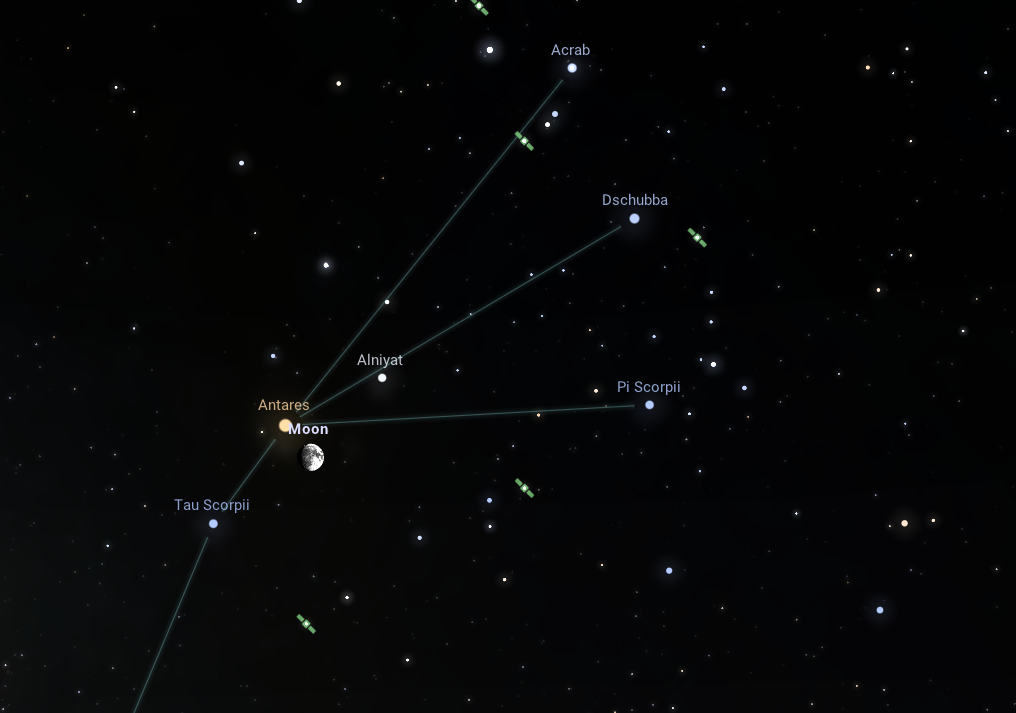 A nyári égbolt szerelmesei bizonyára felismerik az égbolton a csillagok által kirajzolt legyezőalakzatot, amely a Skorpió csillagkép igencsak közkedvelt aszterizmusa. Július 17-én este ez a látványos legyező a Hold közelében is lesz egyúttal, így könnyedén megtalálják a szemfüles észlelők. Aki kimegy a szabad ég alá 22:07-kor, észreveheti, amint a Hold egyre nagyobb, immáron 85%-os fázisában pompázó alakja a Skorpió csillagkép legfényesebb csillaga, az Antares 28'-es közelségébe kerül a déli égbolton.