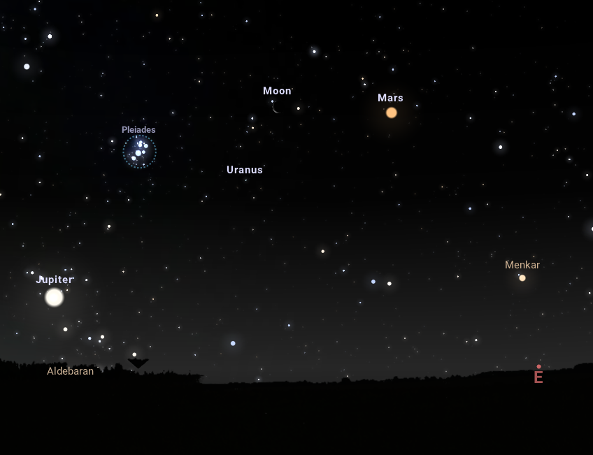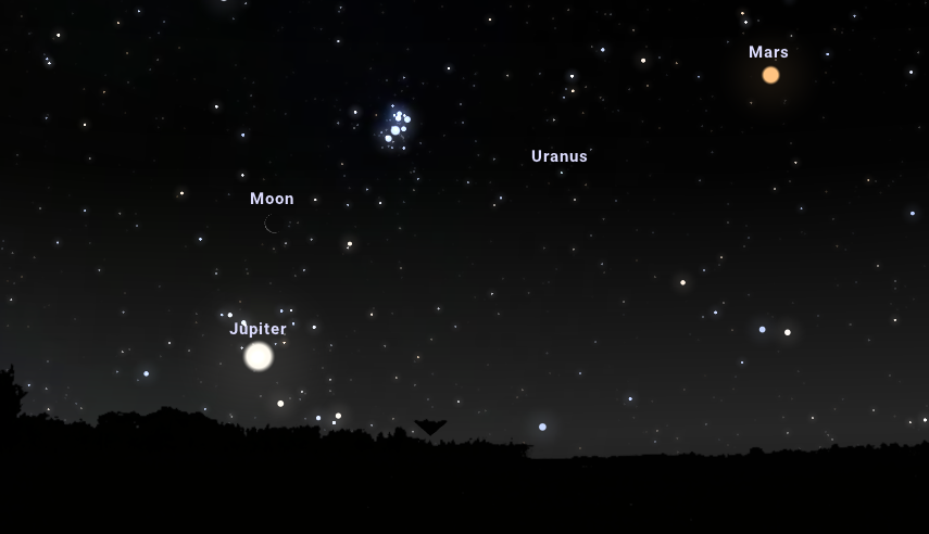Július 2-án hajnalban fél négy felé mindenképpen érdemes felnézni a keleti égboltra, ugyanis a Hold, bolygók és fényes mélyég-objektumok szinte tobzódásszerű közelségét figyelhetjük meg. Ekkor ugyanis egy ív mentén fognak elhelyezkedni az égbolt legfényesebb látványosságai közé tartozó, szabad szemmel is kiválóan megfigyelhető égitestek, mégpedig a vöröses színű Mars, a Hold vékonyka, csökkenő fázisban lévő sarlója, a gyönyörű, kék csillagok alkotta, szabad szemmel is látható Fiastyúk, illetve a Jupiter. Mivel mindezeket a horizont közelében figyelhetjük meg, az észleléshez mindenképpen érdemes olyan helyet választani, amely mentes a természetes és mesterséges akadályoktól. Mivel ezek az égitestek szabad szemmel is kiválóan megfigyelhetőek, így azok számára is teljes lehet az élmény, akiknek nincs távcsövük. Aki magával viszi binokulárját, az még több részletet megfigyelhet az említett égitesteken, például lencsevégre kaphat néhányat a Jupiter holdjai közül, avagy megnézheti közelebbről a Plejádok kék csillagait.