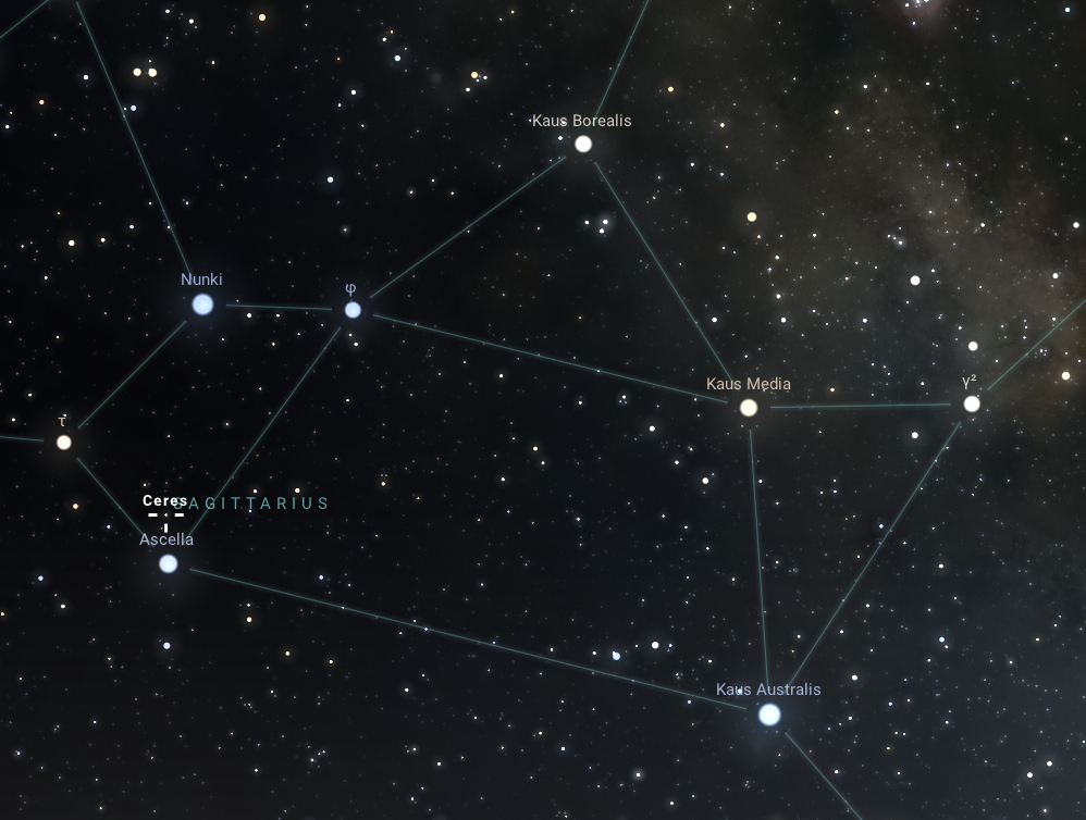 A Ceres a Mars és a Jupiter között elhelyezkedő aszteroidaöv elsőként felfedezett égitestje, Naprendszerünk egyetlen olyan törpebolygója, amely nem a Neptunuszon túl kering. Július 5-én különleges helyzetbe kerül ez az égitest, mégpedig szembenállásba, vagy ahogy a csillagászati szaknyelv nevezi, oppozícióba. Ekkor a Nap, a Föld, illetve jelen esetben a Ceres egy egyenes mentén helyezkedik el, így pályájának egy nevezetes pontján lesz. Az oppozíció idején viszonylag közel lesz majd anyabolygónkhoz, és így 7,0 magnitúdós fényességgel pillanthatjuk meg a Nyilas csillagkép jellegzetes, teáskannát formáló aszterizmusának belsejében a sötétedés beállta után az egész éjszaka. A megfigyeléshez mindenképpen távcső vagy binokulár használata javasolt, a Ceres ugyanis nem látszik szabad szemmel.