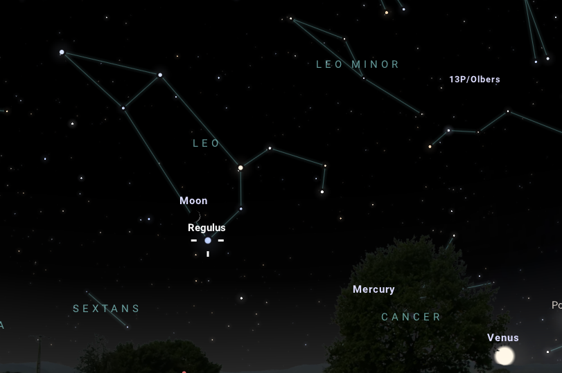 A Hold kedvelőinek igazán jó dolga lesz ebben a hónapban: kísérőégitestünk vékonyka, de immáron dagadó fázisban lévő sarlója ezúttal az Oroszlán csillagkép legfényesebb, éppen ezért könnyen észrevehető csillaga, a Regulus közelségében trónol majd a július 9-i nyugati égbolton nem sokkal este tíz óra előtt. Érdemes megfigyelni ekkor az Oroszlán csillagkép érdekes alakzatát és a mellette jobbra lent, a horizont közelében látható Merkúrt.