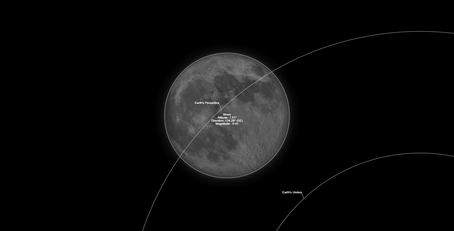 A jelenség 23:04-kor ér véget. Hatalmas szenzációra ne számítsunk azonban: A félárnyékos holdfogyatkozás (a képen látható: penumbral) mindössze a hold érintett peremének sötétedését okozza. Az éles peremű sötét földárnyék (umbra) nem fog beleharapni égi kísérőnkbe.