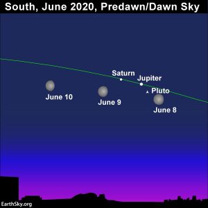 A legcsodálatosabb a látvány június 9-én hajnalban, fél egykor lesz: A 10 fokos magasságban tartózkodó Jupiter és Szaturnusz alatt a halványan derengő narancssárgás Hold gyönyörű egyenlő szárú háromszöget alkot. Később magasabbra emelkednek, míg a Hold elaraszol a Szaturnusz irányába.