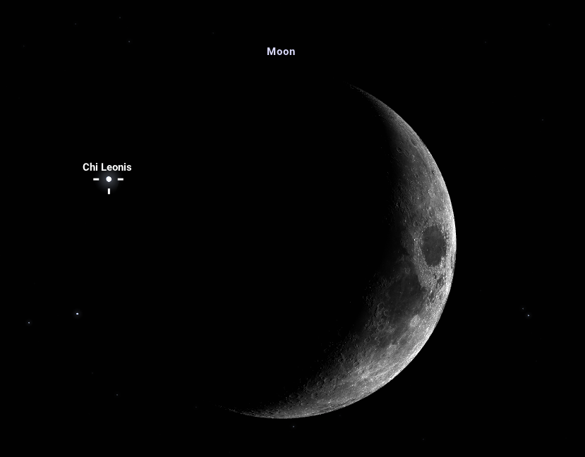 Az első csillagfedést az Oroszlán csillagkép Khí Leonis elnevezésű csillaga szolgáltatja, amely még a szürkületi égbolton, este 21:31-kor belép a Hold hamuszürke fénnyel megvilágított sötét oldalán, annak is a kellős közepén. Talán addigra már megfelelően sötét lesz ahhoz, hogy észrevegyük a Hold körül a nevezetes csillagképek legfényesebb csillagait az égbolton: ekkor ugyanis éppen két állatövi, más szóval ekliptikai csillagkép, a Szűz és az Oroszlán közé ér majd égi kísérőnk, amely csillagképek különös figyelmet kaptak mind a csillagászatban, mind a popkultúrában. Ekkor tehát a Hold bár nem lesz kifejezetten magasan az égen, még egy kevésbé átlátható helyről is van esélyünk észrevenni 16 fokkal a horizont fölött. A belépő csillag látszó fényessége 4,6 magnitúdó, így bár szabad szemmel is észrevehető holdfénymentes égen, azt azonban, ahogy eltűnik a Hold sötét oldalán, érdemes inkább kis távcsővel vagy binokulárral megfigyelni az élmény teljességének eléréséhez a szürkület miatt. Nincs is érdekesebb, mint ahogy egy apró fénylő pontocska elbújik a Hold mögött az égbolton, ahol az előbb még ott volt! Bár kétségkívül látványosabbnak mondható egy ki-, vagy belépés is a világos oldalon, egy hamuszürke fénnyel megvilágított sötét oldali belépés megfigyelése talán a legmegkapóbb.