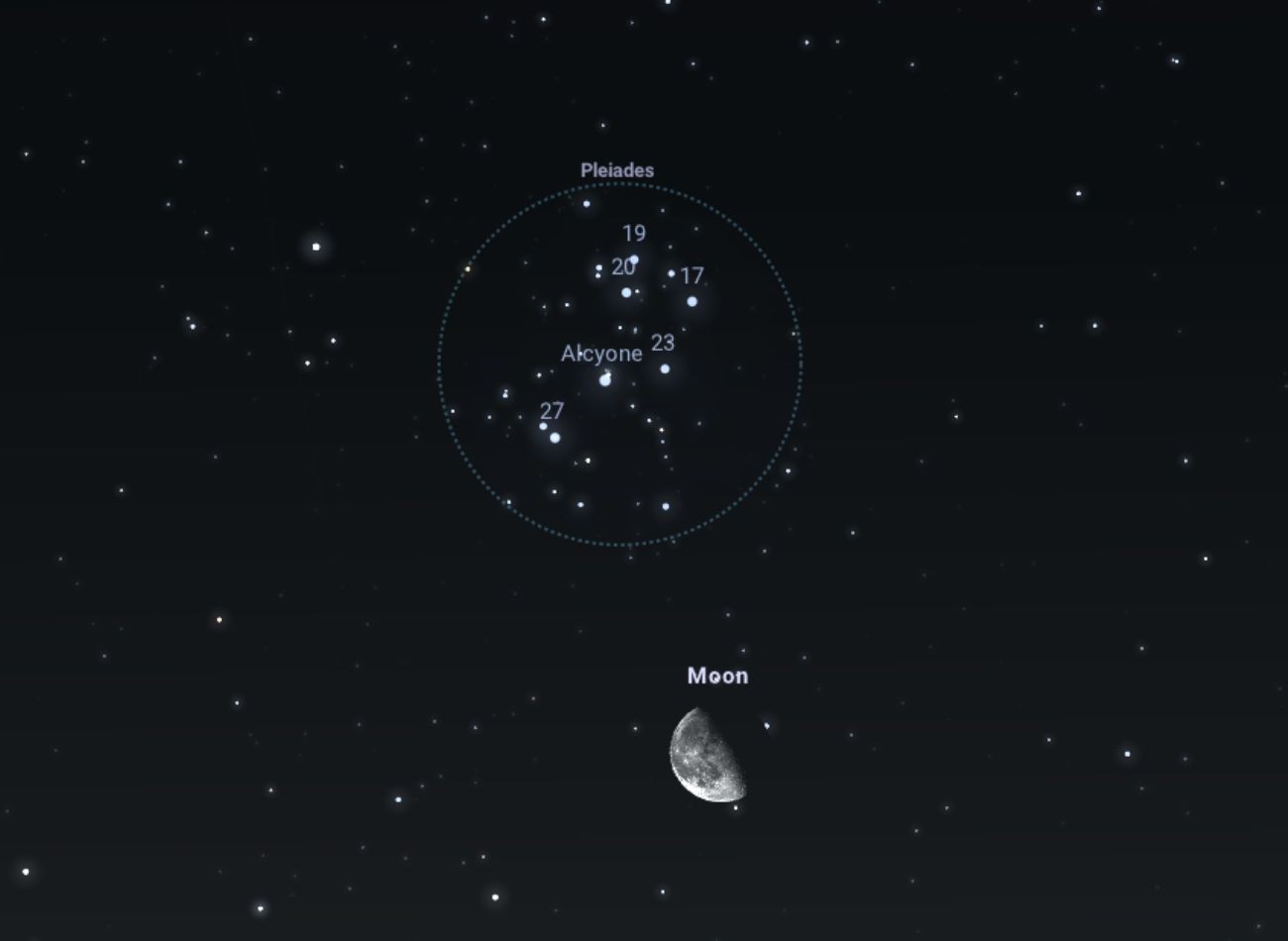 A keddi éjszaka az előző eseményen túl egy szoros együttállással is megörvendeztet bennünket, amit szabad szemmel is észlelhetünk. A Plejádok kiemelkedő szépségű nyílthalmaz a Tejútrendszerben ismert ezer hasonló objektum között. A Földtől 445 fényévre található, és 150 millió évre becsülik a korát, így a Földhöz az egyik legközelebbi nyílthalmaz. Az égen 4 teliholdnyi területet foglal el, és az összfényessége 1,59 magnitúdó. Ennek köszönhetően szabad szemmel is könnyen észlelhető, így már az ókorban több kultúra is ismerte. A keleti égbolton 23:00-kor, 11 fok magasságában láthatjuk a 60%-os Holdat, amely felett 1 fokkal – a telihold átmérőjének a kétszerese – lesz megtekinthető a Plejádok. Szabad szemmel halvány derengésnek fog tűnni, amelyben néhány csillagot láthatunk, de binokulár segítségével már mind a hét fényes csillagát megfigyelhetjük. Távcső használata esetén már néhány tucatnyi halványabb csillagot is észlelhetünk.