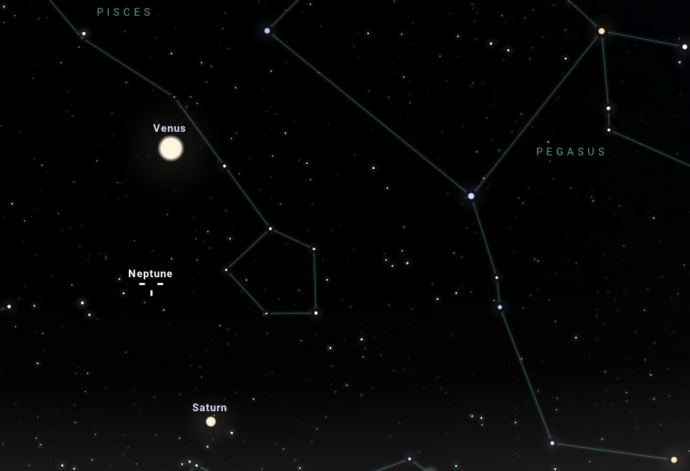 Mindez a nyugati horizont felett, 15 fokos magasságban látszik majd a Halak csillagképben, így az észleléshez érdemes szabadtéri helyszínt választani, még a várhatóan hideg, télies idő ellenére is. Az együttállás idején a Neptunusz megtalálásában segédletet nyújt a fényes Vénusz, avagy Esthajnalcsillag is, amelyet már naplemente után is könnyedén észrevehetünk szabad szemmel. A Vénusz alatt, szintén szabad szemmel megfigyelhetjük az annál jóval halványabb Szaturnuszt is, amelynek gyűrűrendszerét szintén érdemes távcsővel is megvizsgálni. A két említett bolygó között, annak majdhogynem a felező merőlegesén helyezkedik majd el ezen a napon a Neptunusz, és ilyen módon azok is megpróbálkozhatnak a megkeresésével, akiknek eddig még nem sikerült.