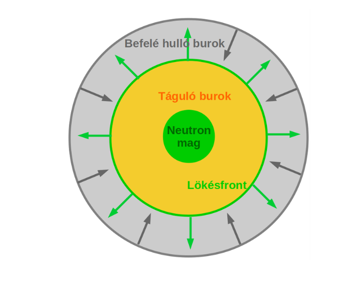 A neutroncsillagok tehát nagy, a Napunk tömegét 8-30-szorosan meghaladó tömegű csillagok halálakor jönnek létre. Az ilyen csillagokban a fúzió egészen a vasmag állapotáig folytatódik. Amikor ez a bizonyos vasmag elér egy bizonyos határtömeget, a csillag magjában felborul az egyensúly, és gravitációsan összeomlik. Ezen összeomlás során a csillag magjából egy kis méretű, sűrű neutroncsillag alakul ki, amelyre behullanak a csillag külső rétegei. Mivel azonban ez a neutroncsillag igen kemény, a befelé hulló burok visszapattan róla, és egy kifelé terjedő lökéshullámot hoz létre. Ezt a jelenséget nevezzük magösszeomlásos szupernóva-robbanásnak.