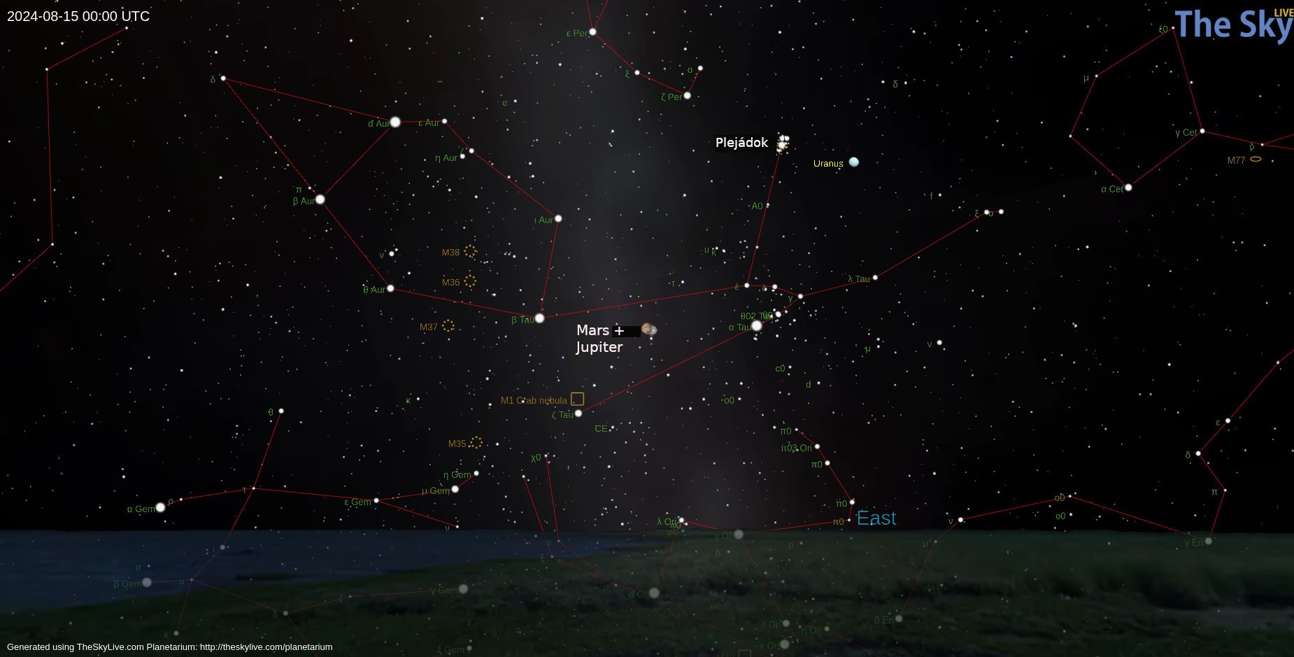 A bolygóktól nem messze, szintén a Taurus csillagkép irányában láthatjuk a szabad szemmel is kivehető és már binokulárral vagy kisebb távcsővel szintén látványos Plejádok (M45, Fiastyúk) nyílthalmazt. A szabad szemmel hét csillagból álló halmaz valójában több mint 1000 tagból áll, amelyek kora 100 millió év körüli, tehát viszonylag fiatalok, és a Naprendszerhez képest távolodnak.