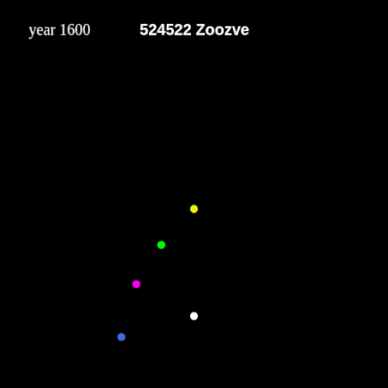 A Zoozve keringési pályája 1600 és 2500 között; sárga: Nap, zöld: Merkúr, fehér: Vénusz, kék: Föld, lila: Zoozve (forrás: Wikipédia)