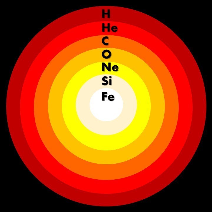 Ez utóbbi azonban csak nyolc naptömegnél nagyobb tömegű csillagok esetén valósulhat meg, mivel csak ezek a csillagok képesek a szükséges hőmérsékletet megteremteni. A mag körül héjak sorozata alakul ki, amelyekben már nem megy végbe fúzió, legbelül pedig egy vasmag marad. Minden fúziós szakasz rövidebb az előzőnél: a szén égése már 1000 év alatt lejátszódik, a vas kialakulása szilíciumból pedig egynapos folyamat. A vasmag az úgynevezett Chandrasekhar-határig (közelítőleg 1,4 naptömegig) képes növelni a tömegét. Végül a rettentő nagy nyomás és magas hőmérséklet hatására az atomokat alkotó protonok és elektronok neutronokká egyesülnek, a csillag magja pedig neutroncsillaggá zuhan össze. Ezen folyamat közben a csillag külsőbb, héjas szerkezetű rétegei a hirtelen összezsugorodott magra esnek. A neutroncsillag anyaga azonban olyan sűrű, hogy ez a szabadon eső köpenyanyag nagy sebességgel visszapattan róla: a csillag ledobja külső rétegeit. Ezt a végső halálhörgést nevezzük II-es típusú, azaz magösszeomlásos szupernóvának. A robbanás során a csillag fénye olyannyira megnő, hogy akár galaxisának fényét is túlragyoghatja.
