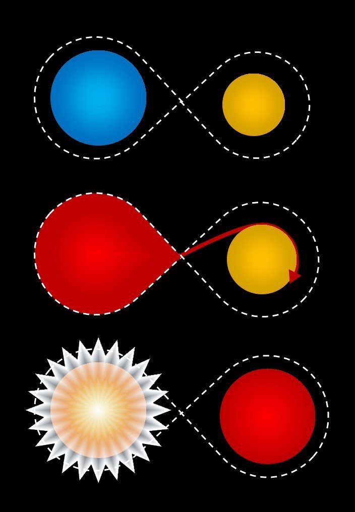 Galaxisunk legtöbb ismert csillaga nem magányosan születik a csillagközi gázfelhőkből. A csillagok jelentős része kettős vagy több tagból álló rendszer tagja. Egy kettős rendszer esetén azonban korántsem biztos, hogy a két csillag kezdeti tömege ugyanakkora. Ekkor, mivel egyedül a tömeg befolyásolja a csillag életének hosszát - minél nagyobb a csillag, annál hamarabb huny ki -, a nagyobb tömegű főkomponens előbb éri el a vörös óriás állapotot. Ekkor kitágul, sugara és térfogata megnő. Idővel kitöltheti saját Roche-lebenyét is. Ez utóbbi az a térfogat a csillag körül, melyben az anyag gravitációsan az adott csillaghoz kötött, így nem tud elszökni. Kettős csillagrendszerek esetében a két csillag Roche-lebenye könnycsepp formájú, a könnycsepp „hegyes” vége a másik csillag irányába mutat. Amennyiben egy csillag akkorára tágul, hogy kitölti Roche-lebenyét, az ezen kívülre kerülő anyag belehull a másik csillag Roche-lebenyébe. Az anyagáramlás egyetlen ponton, az úgynevezett 1-es Lagrange-ponton keresztül történik. Az itt átáramló anyag végül a társcsillagra hullik. A felfúvódott vörös óriáscsillag így külső rétegeinek jelentős részét vesztheti el. Idővel a köpenyét elvesztett csillag szupernóva-robbanásban leli halálát. Ekkor azonban anyaga már nem tartalmaz hidrogént, illetve héliumot, ezek a könnyű anyagok ugyanis átkerültek a társcsillag felszínére.