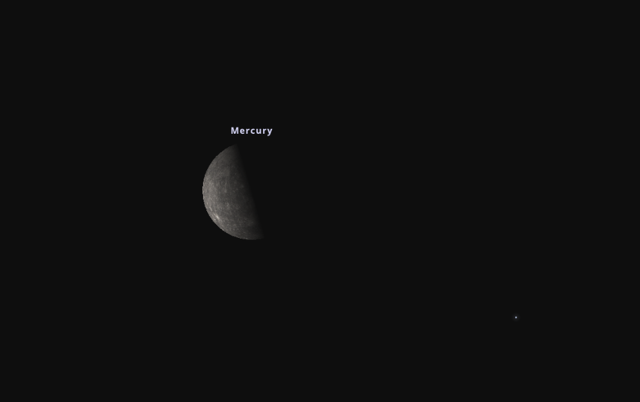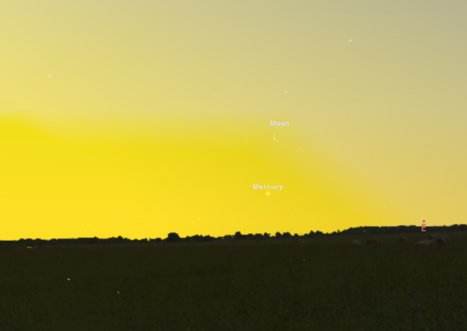 Ami azonban itt más lesz az eddigiekhez képest, az a Hold sarlójának rendkívüli vékonysága és az égbolt hátterének világossága: erre a napra a Hold 6%-os fázis alá vékonyul, így megtalálása a hajnali égbolton már önmagában sem egyszerű feladat, pláne annak tudatában, hogy milyen közel lesz a horizonthoz. A Merkúr még ennél is inkább belekóstol a Földet az égtől elválasztó vonalba, ugyanis nem egészen 2 fokos magasságban lesz az együttálláskor a cérnavékony sarló alakú Hold alatt. Fényessége az előző két nap alatt meglátogatott bolygókhoz hasonló 1 magnitúdós, színe sárgás-fehér . Maga az együttállás hajnali 4:52-kor történik majd meg, így ezen a napon talán egyetlen könnyítésként említhetjük meg, hogy nem kell olyan korán felkelni, mint az előző két napi észleléskor. A megfigyeléshez az élmény teljességének érdekében mindenképpen javasolt a binokulár, vagy kis nagyítású távcső használata.
