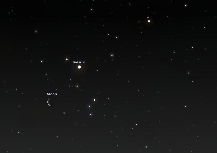 Az együttállások maratonja május 4-én hajnali 4:20-kor veszi kezdetét, amikor a még 22%-os holdsarló a keleti égbolton a gyűrűs bolygóként ismert Szaturnusz közelébe ér. Holdunk a bolygótól 2,7 fokos távolságra, balra lentebb lesz látható, míg a fényessége pedig a szabad szemmel megfigyelhető legfényesebb csillagokéval összemérhető, 1 magnítúdós lesz és nyugodt, sárgás színnel világít majd. A Hold ekkor nagyon közel lesz a keleti látóhatárhoz, mindössze 5 fokos magasságban, így az észleléshez érdemes egy olyan helyet választani, ahol nem gátolnak meg bennünket a fák, vagy egyéb mesterséges akadályok a megfigyelésében.