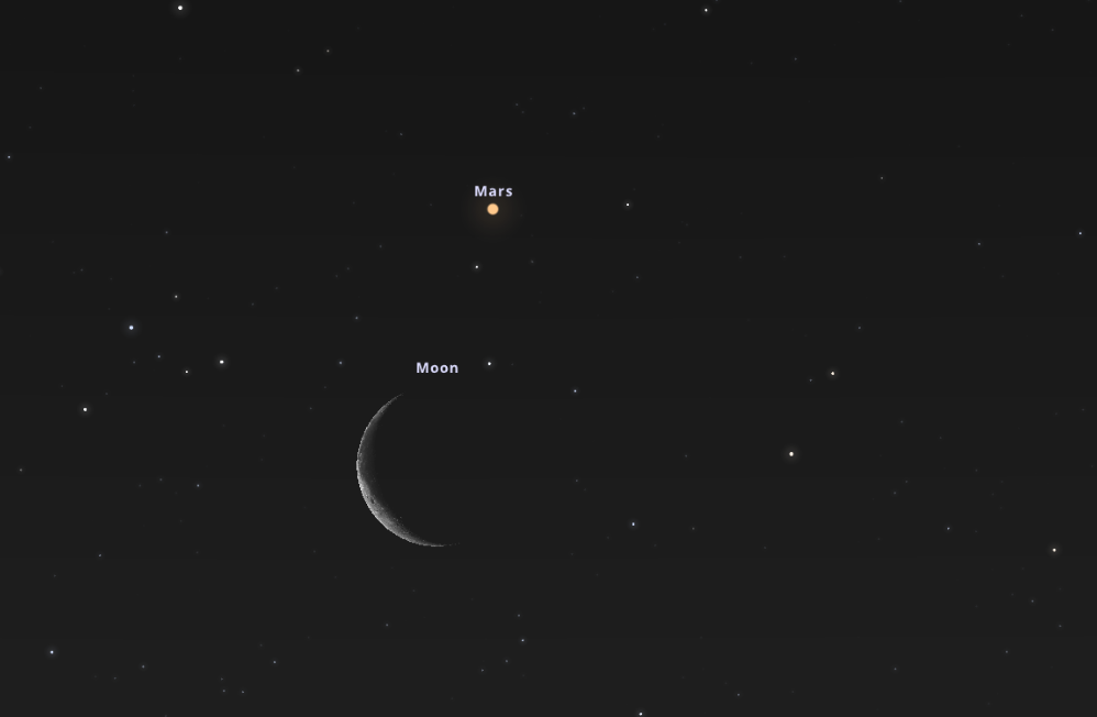 A következő napon, május 5-én szintén egy együttállásnak lehetünk tanúi a keleti horizonton, mégpedig ezúttal a Naprendszer vörös bolygóját, a Marsot közelíti meg a 13%-os fázisúra csökkent Hold. Ezen a napon 4:30-kor érdemes megfigyelni a szoros együttállást: a Mars ekkor mindössze 37'-nyi (bő Holdkorong átmérőnyi) távolságra lesz a Hold sarlójának csúcsától, attól fentebb. A Szaturnuszhoz hasonló lesz fényessége, szintén 1 magnitúdó, de a vörös színe nagyon kontrasztosan eltérő a gyűrűs bolygótól. Mindenképpen érdemes megfigyelni ezt a különleges látványosságot is, azonban ezt az előző napinál is nagyobb kihívás lesz: a Hold az együttállás pillanatában már csak 4 fokos magasságban lesz a látóhatár felett.