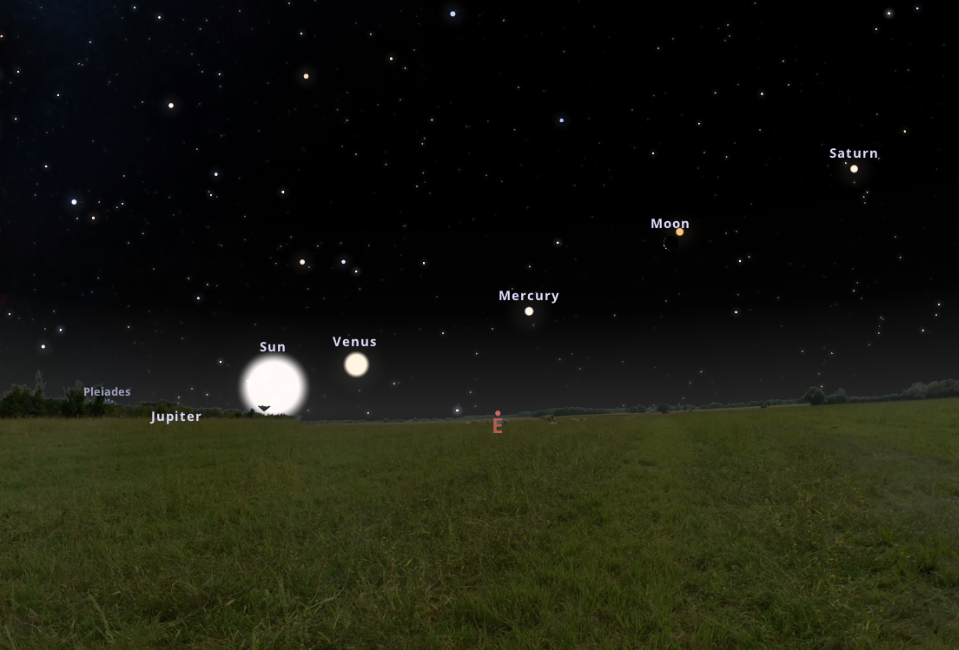 Május eleji hajnali égbolt a Merkúron kívül a többi bolygó látványában is bővelkedik. A Hold vékonyka, csökkenő sarlója is gyönyörű látványt nyújt majd keleten, amint együtt áll először a Szaturnusszal, majd másnap a Marssal, harmadnap pedig a Merkúrral. Ezeket az együttállásokat szabad szemmel vagy látcsővel is érdemes lesz megfigyelni.