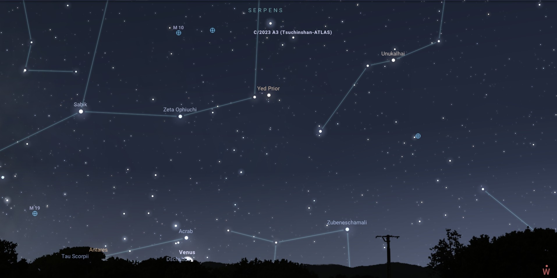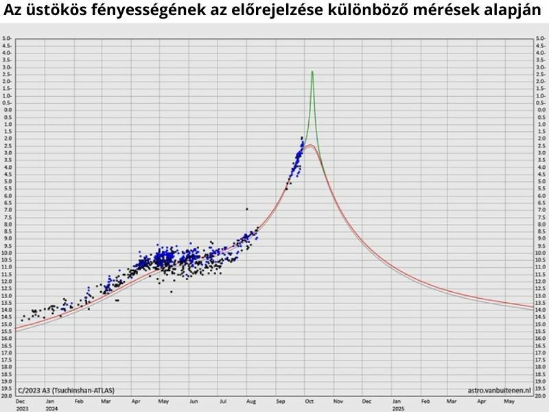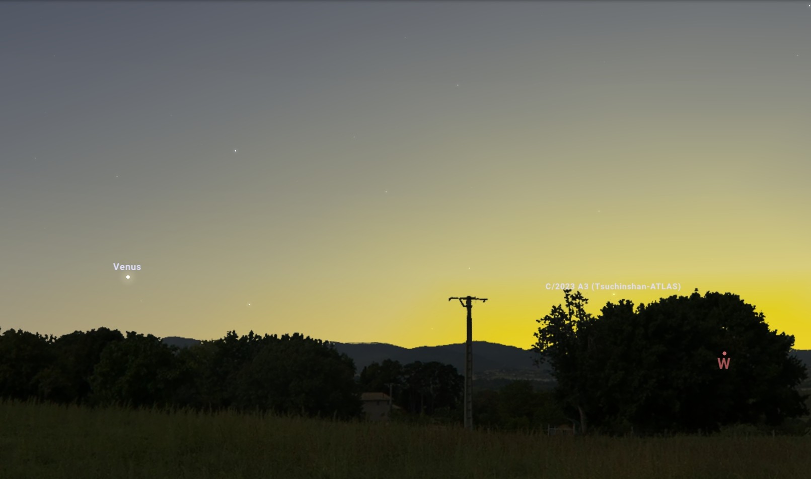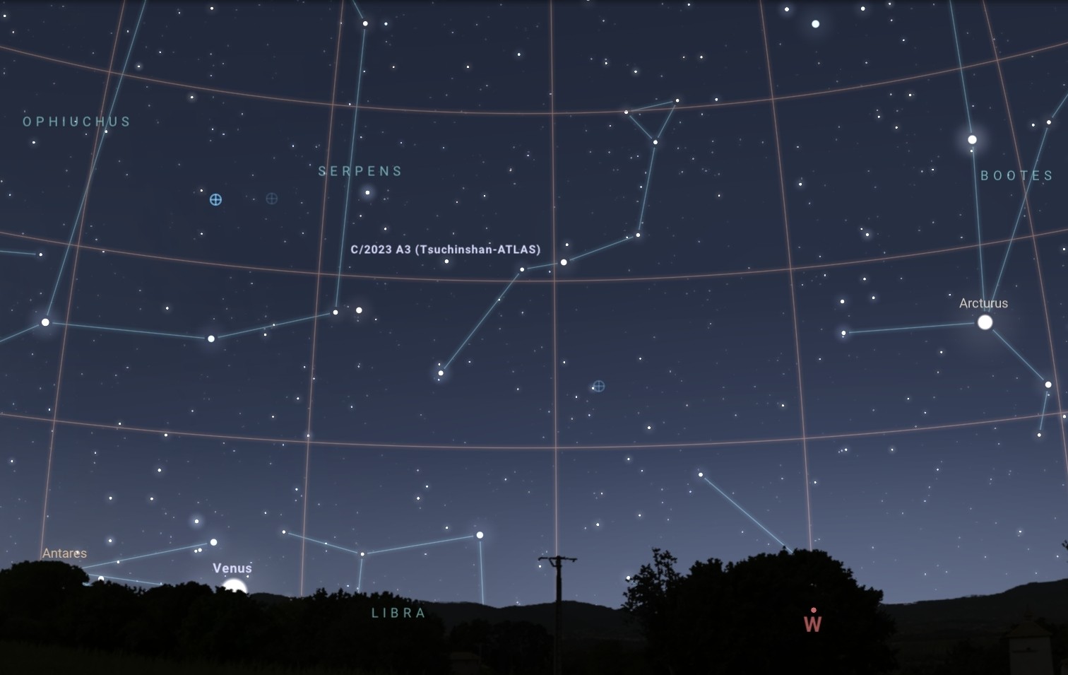 Az első alkalom, amikor megfigyelhetjük a C/2023 A3 (Tsuchinshan-ATLAS) üstököst október 11-én, pénteken este lesz. Naplementekor a nyugati égbolt felé kell tekintenünk, és az első néhány napban különösen fontos, hogy kitakarástól mentes, teljesen sík látóhatárunk legyen. 18:40-kor a Nap már 7 fokkal a horizont alatt jár, az üstökös pedig 4 fokos magasságban lesz. A megtalálásában némi támpontot ad a fényes Vénusz: Az üstökös kicsivel lejjebb jár az égen, mint a bolygó, és a Vénusztól 29 fokkal (két kinyújtott kezű kisarasz) kell nyugati irányban keresnünk. Előreláthatólag legalább 2-3 magnitúdó közötti fényességű lesz a kométa, így még a távol levő 60%-os Hold ellenére is megpillantható a halvány, elnyúlt alakú derengő foltja. Binokulárban sokkal könnyebben láthatjuk a fényes üstökösmagot, amelyből a kiinduló por- és ioncsóvákat is észlelhetjük. A csóva mérete és alakja igen izgalmasan alakulhat. Az esti égen való megjelenés napjaiban ugyanis az üstökös úgy fordul, hogy a csóva síkjában látunk rá, így az üstökösön látványos ellencsóva alakulhat ki, mintha a csóva irányával ellentétes oldalon egy másik csóva indulna. Az égitest október 11-én 19 óra után nem sokkal fog a látóhatár alá bukni, de elképzelhető, hogy tiszta észlelőhelyről a csóvája még ekkor megfigyelhető lesz.