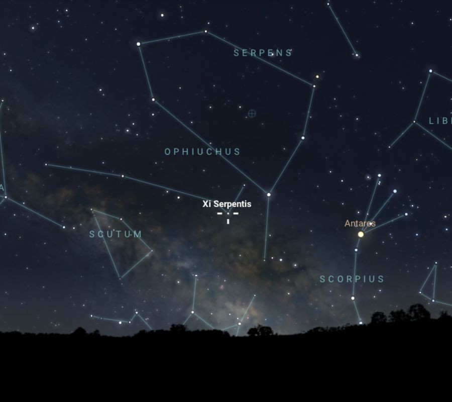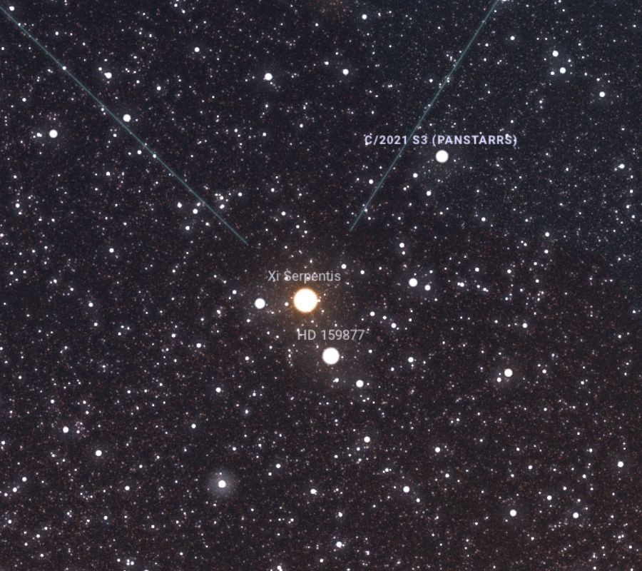 Egy binokulárban akár egyszerre is láthatjuk a fehér színű csillagot és a 7,4 magnitúdós kométát. A Kszí Serpentis 105 fényévre található tőlünk és majdnem 7000 Celsius-fokos a felszíni hőmérséklete. A Napunknál kétszer nagyobb csillag – 3 millió kilométeres az átmérője – 19 fokos magasságban lesz, így a fényszennyezés már kevésbé zavarja az észlelést.