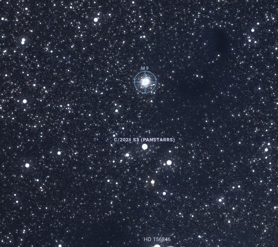 Szerencsére sokkal ígéretesebb lehetőségünk lesz ugyanezt az üstököst észlelni február 13-án, kedden, 05:00-tól. Ismét a délkeleti égboltra kell tekintenünk, azon belül a Kígyótartó csillagképet kell felkeresnünk. 15 fokos magasságban szeli az égboltot a 7,5 magnitúdós égi vándor, és csak 22 ívperce lesz a Messier 9 gömbhalmaztól. A kis távolság miatt – kevesebb mint a Hold látszó átmérője – akár egyszerre is észlelhetjük a kettőt. Az M9 a híres francia csillagász, Charles Messier vezetéknevét viseli, aki a korszaka nagy üstökösvadásza volt. A távcsövével több kométát is felfedezett, ahogyan azok elmozdultak a háttércsillagok között. Azonban olyan égitesteket is észlelt, amelyek üstökösszerűek voltak, de nem mozdultak el a csillaghoz képest. A csillagász egy nagy katalógust hozott létre, amely több mint 100 objektumot tartalmazott. A 25.800 fényévre lévő hatalmas csillaghalmaz 90 fényév átmérőjű és 250.000 ezer csillag otthonául szolgál. Rendkívül gyorsan, 224 km/s sebességgel távolodik a Földtől, és csak 5.500 fényévre található a Tejútrendszer központjától. A 8,4 magnitúdós gömbhalmaz 10-15 centis távcsőben megfelelő – több százszoros – nagyítással már csillagokra bomlik.