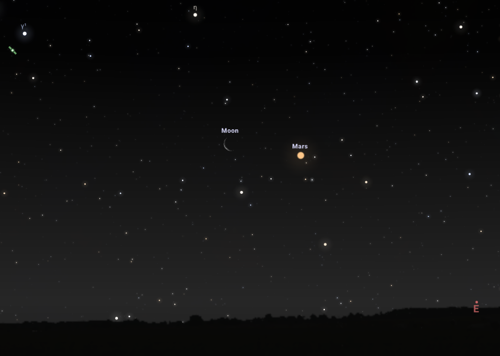 A Hold vékony sarlójához ezúttal Naprendszerünk negyedik bolygója, a vörös bolygó néven is ismert Mars kerül 3 fokos közelségbe. Aki szeret nagyon sokáig fennmaradni este, avagy a szokásosnál is korábban kelni reggel, mindenképpen nézze meg az együttállást június 3-án, hétfőn reggel 3:30-kor! Felhívjuk a figyelmet arra, hogy a konstelláció 2:40-2:50 között kel fel a keleti égbolton, és körülbelül másfél-két órán át lesz látható, ugyanis nem sokkal hajnali 4 óra után elmossa a látványt a közelgő napkelte fénye. Ez tehát egy igencsak szűk időintervallum, így résen kell lennie annak, aki szeretné megfigyelni. Természetesen a Hold, illetve a Mars is látszik szabad szemmel, de binokulárral közelebbről is megvizsgálhatjuk mindkét égitestet.