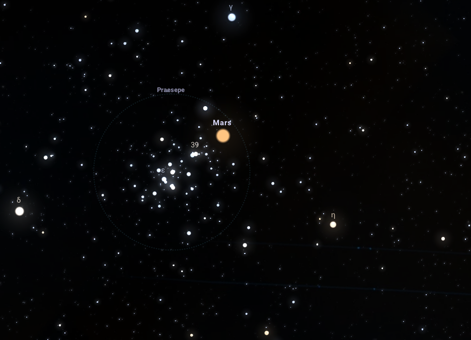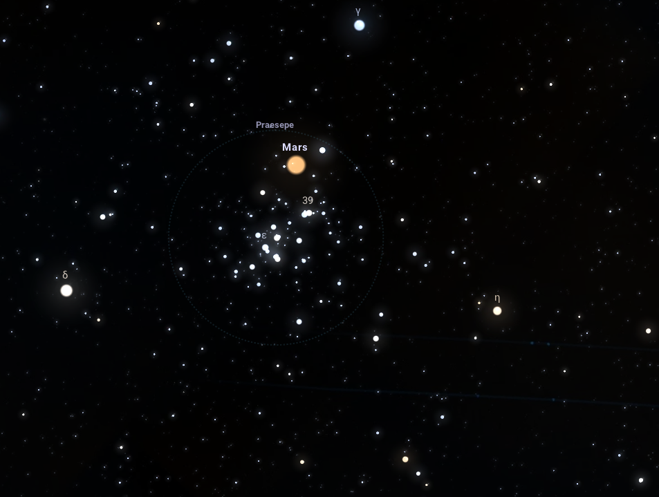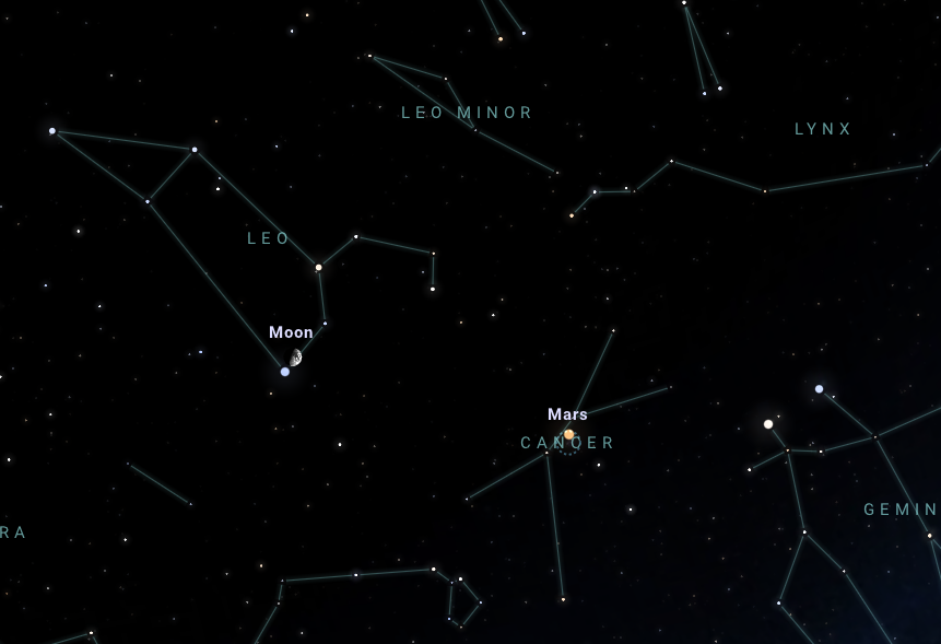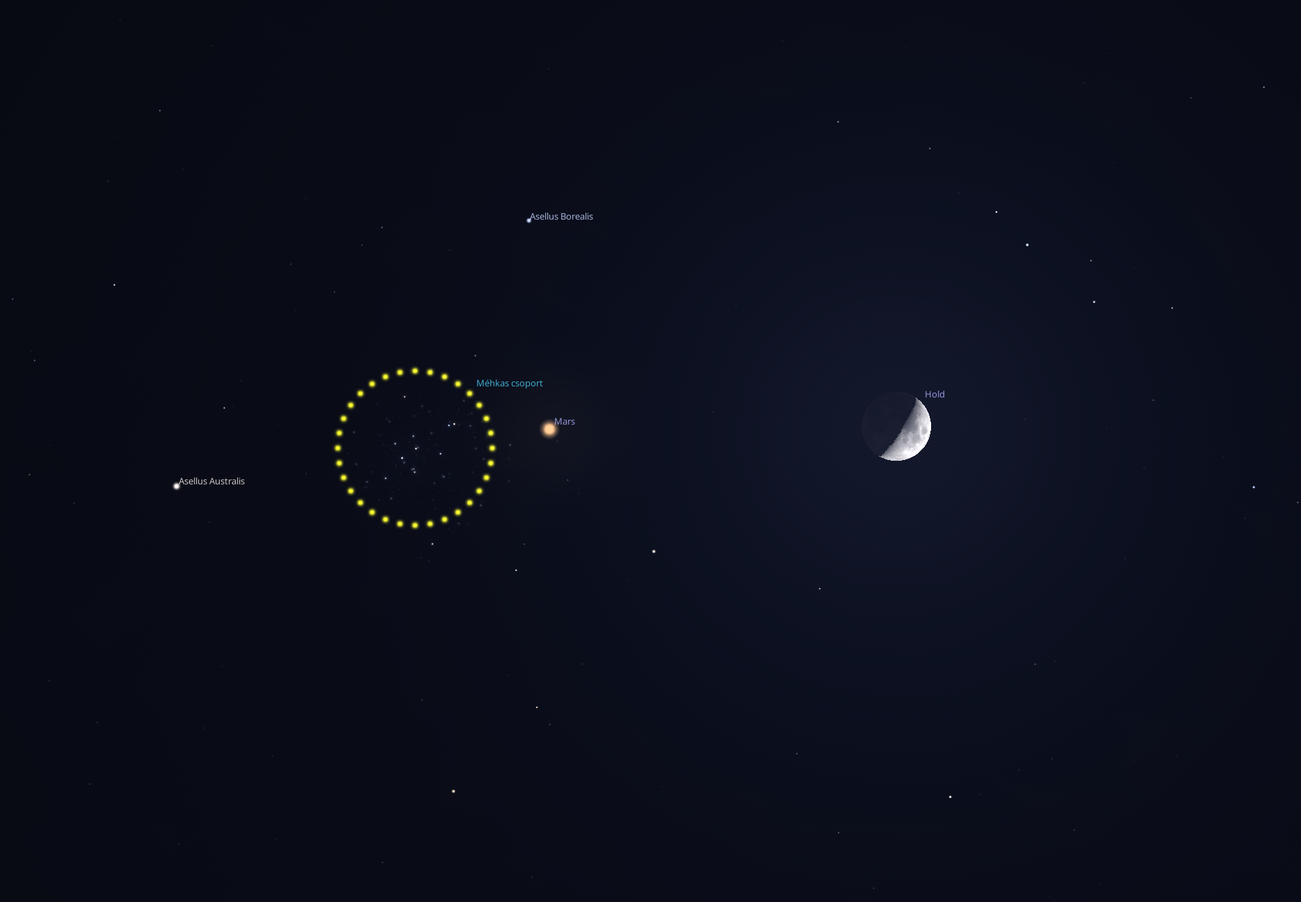Az első látványosság tehát a május 3-i napra tehető, amikor is éjfél előtt nem sokkal, 23:50-kor a Hold 45%-os fázisú alakja megérkezik a Rák csillagképben tartozkodó Mars, illetve az M44-es katalógusszámmal ellátott, Jászol-halmaz néven is ismert Praesepe közelébe. Mindez a nyugati horizont felett 22 fokos magasságban látszik majd, s égi kísérőnk körülbelül 1,9 fokos távolságba ér a vörös bolygótól a jelenség idejére.