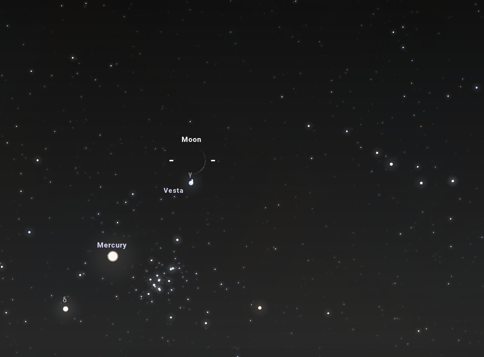 Július 7-én este fél tízkor a Merkúr látványos együttállásba kerül a Hold vékony, dagadó sarlójával: attól 2,5 fokra balra lentebb lesz megtalálható. A páros ekkor is a Nap, illetve a nyugati horizont közelében tartózkodik majd, de aki szereti a kihívást, és érdeklődik az együttállások iránt, bátran próbálja meg az észlelést. A Hold vékony sarlójának távcsöves megfigyelése szintén érdekes élménynek bizonyulhat.
