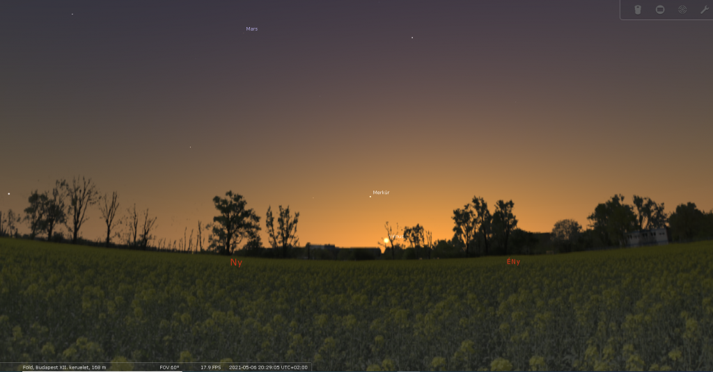 - Május 6-án a Nap mögül kibukkanó telimerkúr már jól látható fogyásnak indul, 68%-os fázisa mellé még elég apró, 6,2”-es korongátmérő tartozik. Fényessége nagy, -0,7 magnitúdó, így már feltűnően pislákol a naplemente után háromnegyed órával, háromnegyed kilenckor az esti égen.