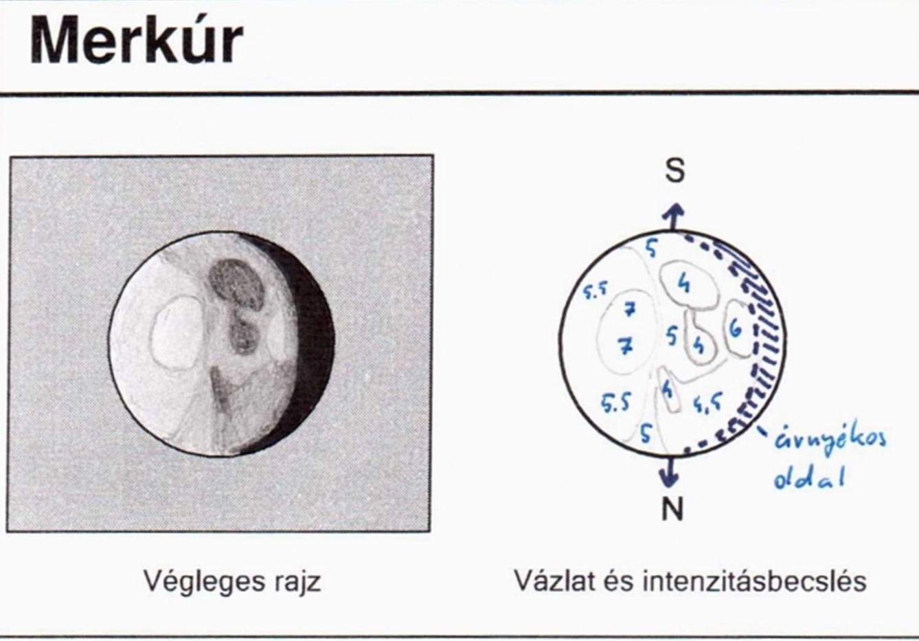 Ennél nagyobb műszerekkel (vagy nagyon jó minőségő, 8-10 cm-es távcsövekkel is akár) érdemes megpróbálkozni a felszíni részletek megpillantásával, ugyanakkor ehhez tapasztalt szemre lesz szükségünk. A Merkúr alakzatainak kontrasztja nagy, a Mars tengereinél könnyebben megpillantható a sötét medencék és fényes, kisugárzó foltok mozaikja. A horizontközeli helyzet a remegő levegővel azonban türelemre és gyakorlásra int.