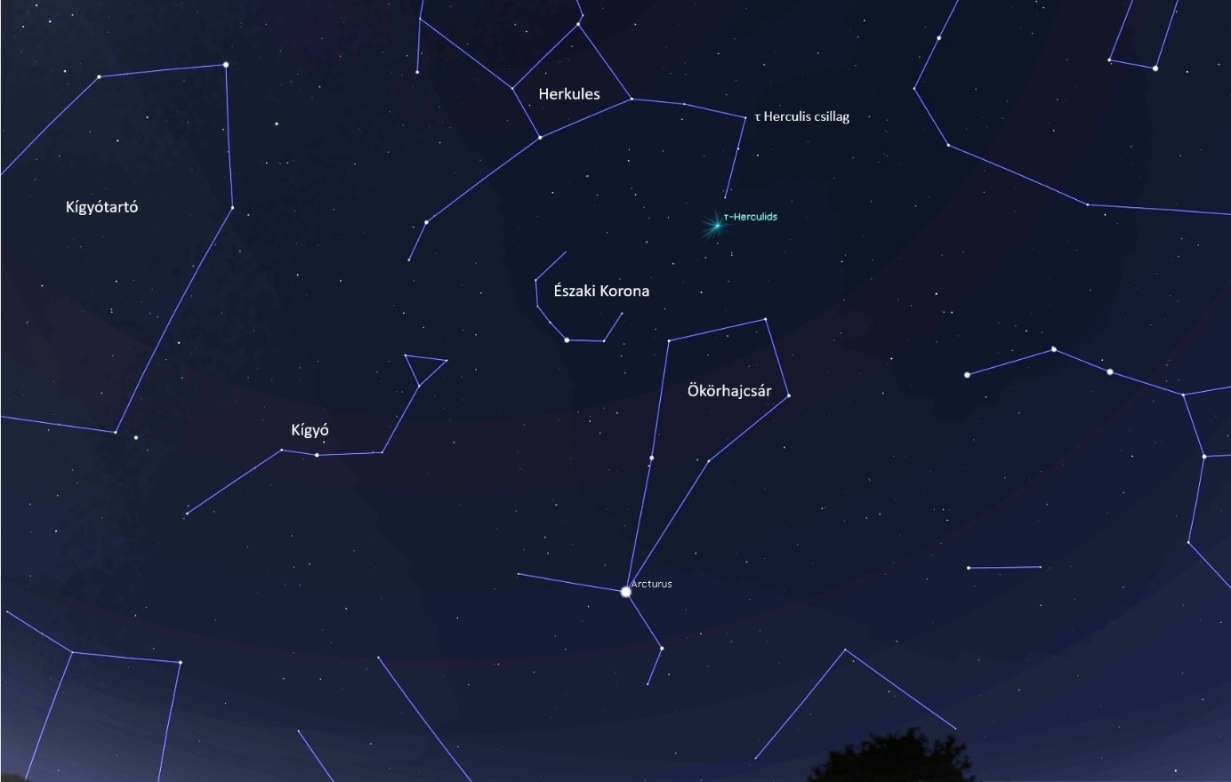 Tau Herculidák – mégis, onnan van e csodás név? A hullócsillagrajok a radiánspontjukról kapják a nevüket, vagyis onnan, ahonnan látszólag kiindulnak. Ezt úgy kell elképzelni, hogy ha képzeletben összekötnénk a meteorok ioncsatornáit (népiesen: csóváit), akkor egy pontban metszenék egymást – ez a radiánspont. A Tau Herculidák radiánspontja tehát a Herkules csillagkép tau jelű csillagánál van, illetve volt, 90 éve, de a Jupiter már említett pályamódosító hatása miatt a radiánspont arrébb vándorolt, és most már az Ökörhajcsár (Bootes) csillagképben található. Az alábbi ábrán ezt mutatjuk: