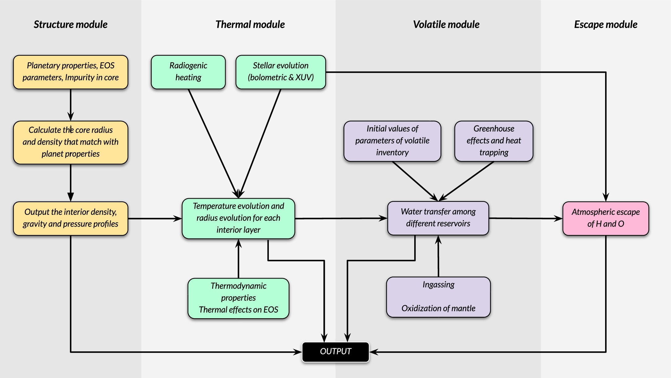 1. Szerkezeti modul: ezen modul segítségével a cikk szerzői a bolygón belüli rétegeket modellezik Földhöz hasonló belső szerkezetet feltételezve. Ilyen módon tehát a bolygó áll egy vasmagból, valamint egy belső- és egy külső köpenyből. A kérget nem tartalmazza a modell, hiszen annak összetétele rendkívül bonyolult lehet.