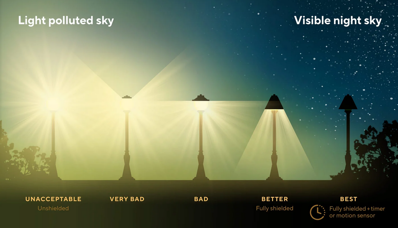 - utcai fények: noha a legtöbb utcai lámpa, avagy kültéri világítóegység átalakítható lenne olyan módon, hogy kevésbé szennyezze be a csillagos égboltot, a legtöbb településen még nem ilyen az utcai világítás.