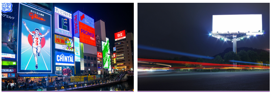 - világító hirdetések: az elektronikus hirdetőtáblák kifejezetten veszélyesnek bizonyulnak az ember számára is. A modern, LED-es izzókkal ellátott hirdetőtáblák amellett, hogy a kelleténél jóval fényesebbek, így káprázást okozva elvonhatják az autót vezetők figyelmét az útról, és így baleseteket okozhatnak, káros hatással lehetnek bizonyos állatok életritmusára is. Emellett az ilyen hirdetőtáblákból kibocsátott fény szinte teljes egészében az égboltot terheli.