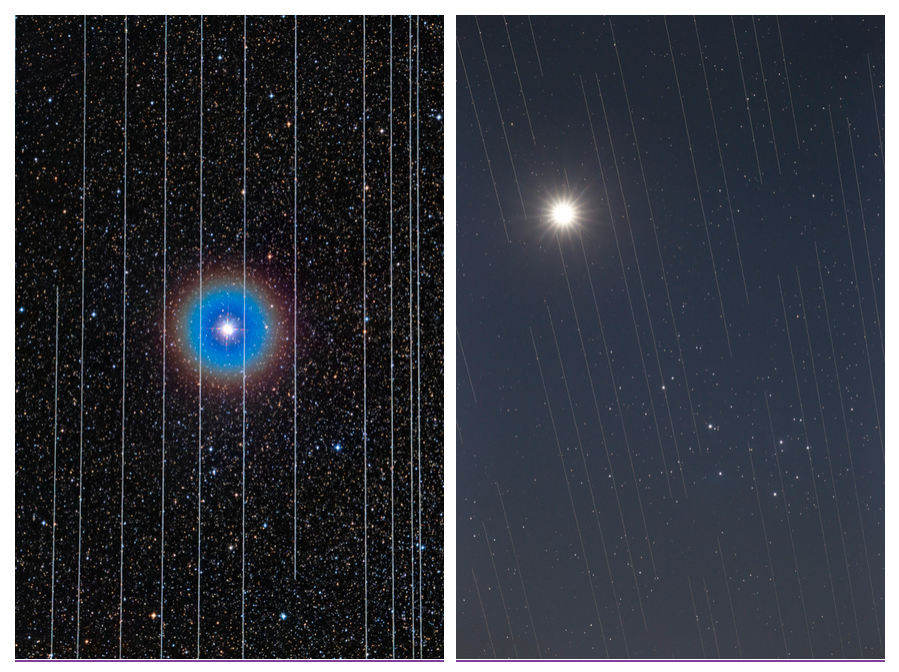 - műholdak: az utóbbi időkben egyre jelentősebbé vált a Föld körül keringő, jórészt kommunikációs műholdak fényszennyező hatása. Ezeknek a műholdaknak a száma napjainkban rohamosan növekszik, és így gátolja az égbolt halvány fényű objektumait kémlelő csillagászok munkáját. Egy nemrégiben megjelent tanulmány szerint a Föld körül keringő mesterséges holdak több mint 10%-kal megnövelik az éjszakai égbolt fényességét.