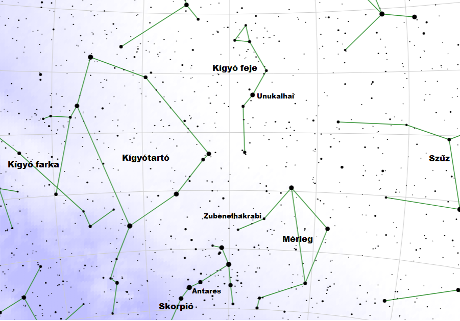 De mennyit is kell felfelé menni? Körülbelül 40 fokot. És hogy ezt hogyan tudjuk könnyen megtenni? Mi sem egyszerűbb! Fogjuk a kezünket (na jó, megfogni a másik kezünkkel azért nem kell) és nyújtsuk ki. Ekkor nagyaraszunk körülbelül 20 fokos távolságot fog át. Szóval a kétszeres nagyarasznyit kell felfelé mennünk, a 2,6 magnitúdós Unukalhaiig. Ettől még egy kicsit felfelé található magának a kígyónak a feje, lefelé pedig a kígyó testének egy része. A beazonosításhoz (és a megkereséshez is) érdemes megnézni a mellékelt ábrákat.