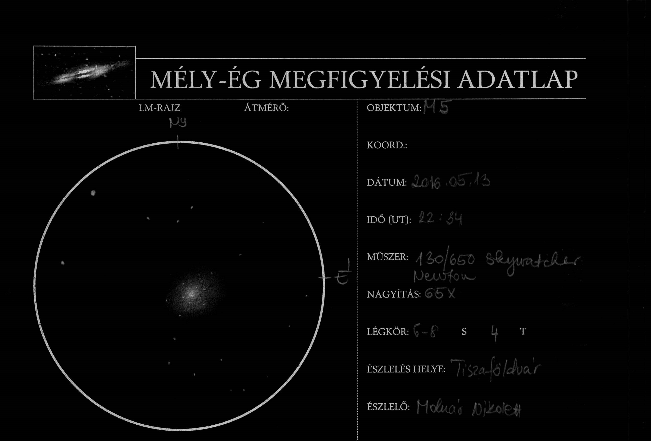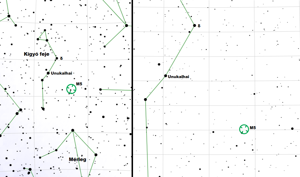 Az első célpontunk egy fényes gömbhalmaz lesz, amely az M5 katalógusnevet viseli. Megtalálása viszonylag egyszerű az Unukalhaitól elindulva, a mellékelt keresőtérkép alapján. Még egyszerűbb, ha már szabad szemmel is látjuk, hiszen ekkor csak „rá kell állni" a távcsővel. Mivel fényessége 6,2 magnitúdó, ezért szép égről már távcső nélkül is látható, azonban a keresőtávcsőben már biztosan észrevehető. Azonban vigyázat! Szabad szemmel sokszor csak egy halvány csillagnak látjuk a 17 ívperces átmérőjű objektumot, a halványsága miatt. Ez a „halványság" azonban távcsőben úgy felerősödik, hogy szinte ki fogja ütni szemünket. Ez azt jelenti, hogy már kistávcsővel, akár binokulárral is nagyon szépen mutat. Kistávcsőben az első pillantásokhoz mindenképpen mérsékelt nagyítás (30-50 szeres) ajánlott, azonban érdemes lehet egy kicsit jobban ránagyítani, mert ekkor jobban előtűnnek a gömbhalmaz apró részletei (például fel lehet benne fedezni külön-külön csillagokat is).