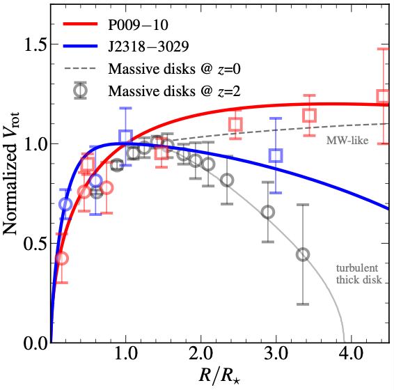 A galaxis sugara mentén észlelhető sebességváltozást a kékeltolódású (felénk mozgó), valamint a vöröseltolódású (távolodó) gáz vizsgálatával figyelték meg. (Lásd 1. ábra) Érdekes módon a távoli Világegyetemben a korábbi tanulmányokban felrajzolt rotációs görbék a galaxisok peremére csökkenő sebességet mutatnak, ami a sötét anyag kis mennyiségére utal. A mostani eredmények azonban lapos rotációs görbét adnak ki, ami a Földhöz közeli, nagy tömegű koronggalaxisokra jellemző, rámutatva, hogy szükség van a sötét anyagra a nagy sebességek magyarázatához. (3. ábra).