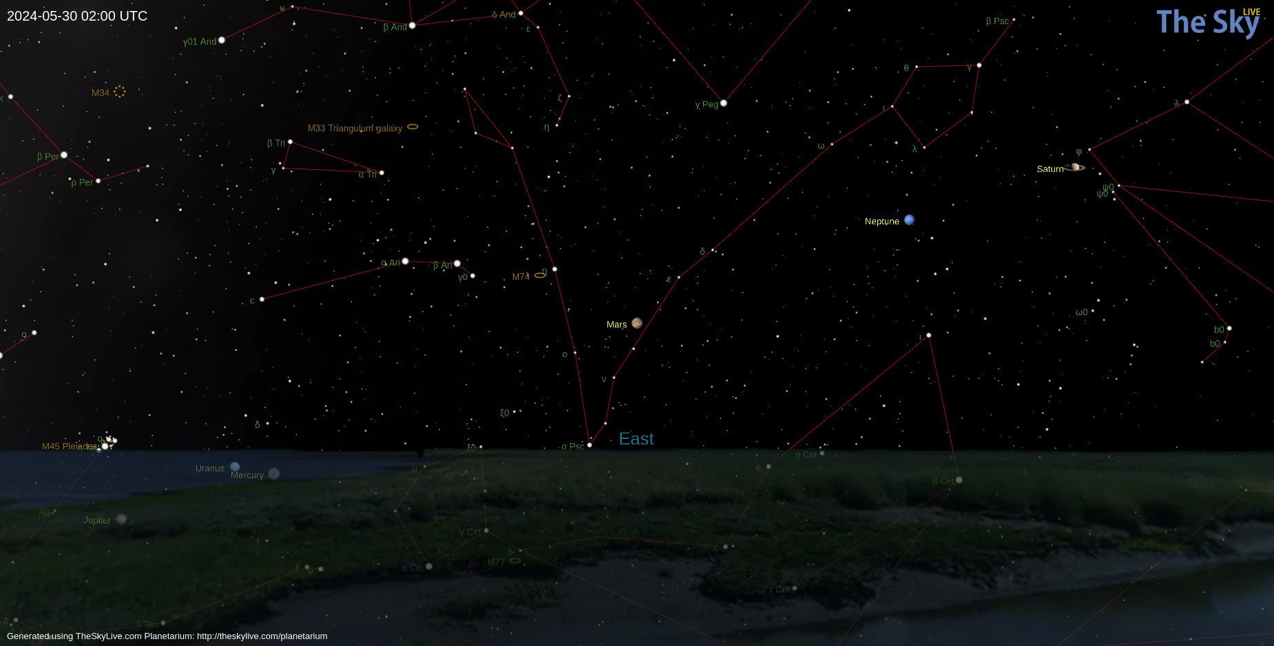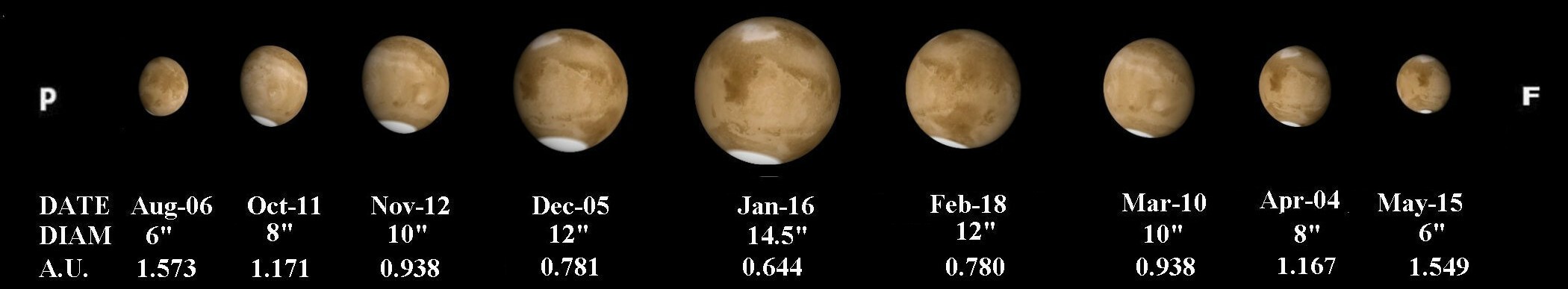 A Mars a pályája során a napokban, május 8-án éri el a Naphoz legközelebbi pontot, a perihéliumot. A déli poláris sapkájának mérete ennek következtében gyorsan csökken. A Novus Mons kiterjedése és a Syrtis Major szélessége is csökken. A Serpentis-Hellaspontus képződmény felett porfelhők jelenhetnek meg, illetve ebben az évszakban porviharok is várhatók. A Mars látszó átmérője 4,8” lesz.