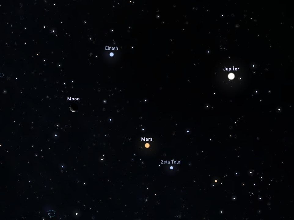 Ezen a keddi napon tehát a Mars, a Jupiter, az Aldebaran, illetve a 42%-os fázisú Hold helyezkedik majd el egymáshoz közel, és formáz egy jól kivehető négyszöget a keleti égbolton. Hajnali 4 órakor a Hold jellegzetes, C-alakot formázó sarlója 48 fokos horizont feletti magasságban a Bika csillagképet fogja majd ékesíteni, így segítségével könnyedén megtalálható a többi említett égitest is: tőle lefelé és kicsit balra egy összetéveszthetetlenül fényes korong formájában látszik a Jupiter. Ezt külön is érdemes megnézni annak, akinek van binokulárja, mert azzal kiválóan látszanak az éppen megfelelő pozícióban lévő Galilei-holdak a bolygó körül. A Jupitertől balra lefelé virít a Mars jellegzetes, vörös színével, a Jupitertől jobbra, kicsit lefelé pedig a Bika csillagkép legfényesebb csillaga, az Aldebaran nevű narancssárga óriás foglal helyet. Ebben a hónapban igazán szerencsésnek mondhatja magát a Bika, hiszen nemcsak hogy fényes csillagok és nyílthalmazok, hanem még bolygók és a Hold is tarkítja. Az Aldebaran mellett ugyanis a Hyadok látszik, kicsit feljebb pedig a Plejádok, avagy Fiastyúk. Utóbbitól egy kicsit jobbra és lefelé a szemfülesek megtalálhatják távcsövön át nézve az Uránuszt is.