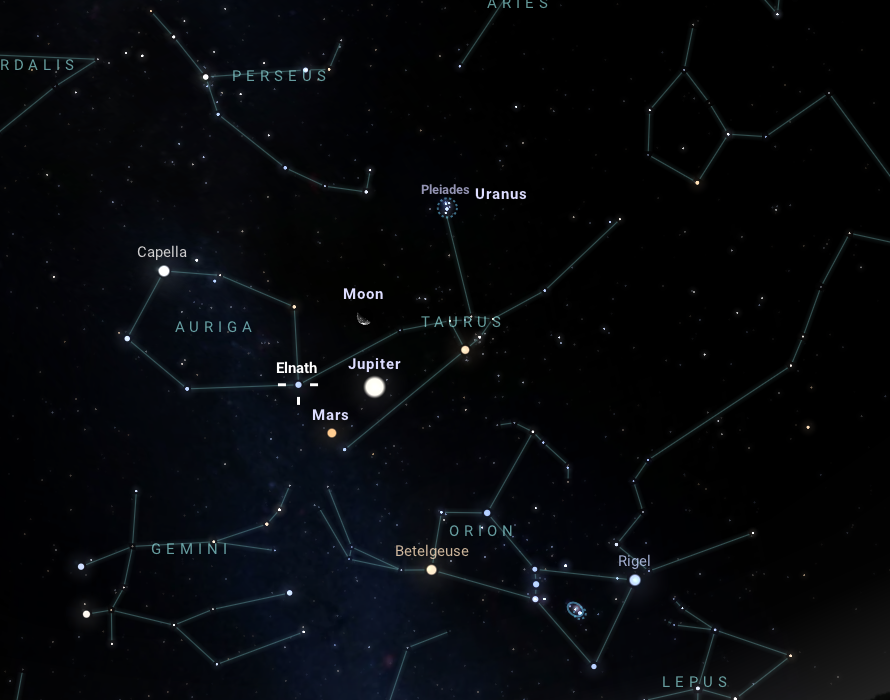 A következő, szerdai napra egy kicsit átrendeződik majd a Bika csillagkép ábrázata. Ekkorra ugyanis a Hold egy kicsit odébb vándorol társaihoz képest a keleti égbolton, sarlója pedig 32%-osra csökken. Ekkor azonban szintén örvendezhetnek a geometriai alakzatok kedvelői, ugyanis szépséges deltoid világlik majd ki az ég sötétjéből hajnali 4 órakor. A négyszöget ezúttal a Hold sarlója mellett az előző négyszögből is ismert Mars, illetve Jupiter alkotja, végül pedig az Elnath, vagy Beta Tauri elnevezésű csillag. Ez a csillag szabad szemmel is jól látható 1,7 magnitúdós látszó fényességével, és érdekessége, hogy összeköti egymással az Auriga és a Taurus csillagképeket.