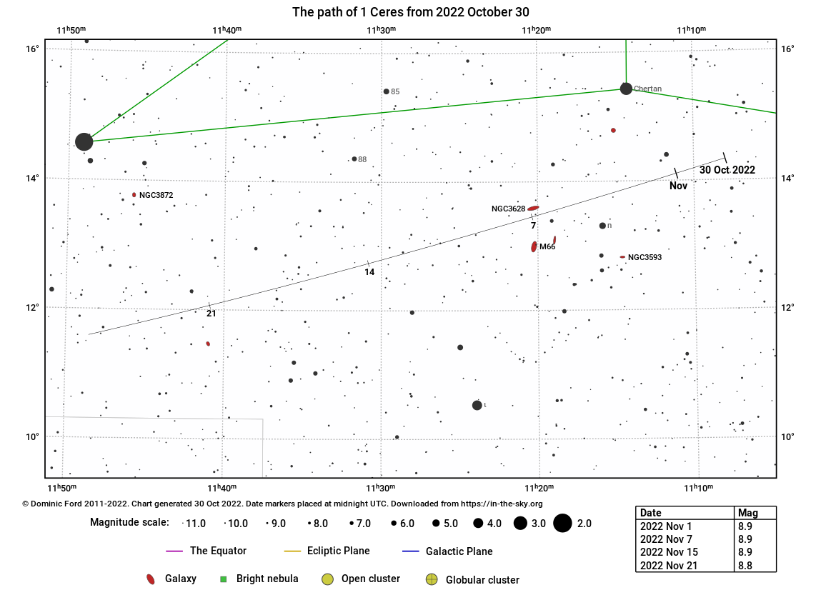 Naprendszerünk sokáig legnagyobb kisbolygója (2006 óta törpebolygó, mint a Pluto) ideális célpont lehet azoknak, akiknek még nincs tapasztalatuk a kisbolygókeresésben, és gyakorolni szeretnének. Ehhez nyújt segítséget az 5-én éjszaka, illetve 6-án hajnalban tetőző Ceres – M65 közelítés, amelynek során a törpebolygó 27 ívperccel északra halad el az M65 galaxistól, ez egy szűk holdátmérőnyi közelséget jelent. A Ceres 8,9 magnitúdós, közepes égről 8-10 centiméteres teleszkóppal már kereshetjük.