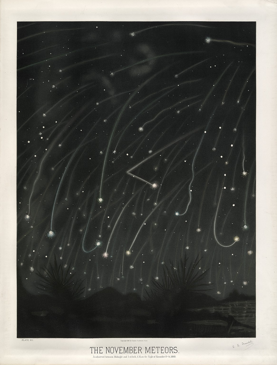 Csakhogy a Leonidák időről időre ún. kitöréseket produkál, amikor a ZHR akár 27 000-re (!!!) is felkúszhat. 1833-ban ez történt, a jelenségről a metszet hűen tanúskodik: