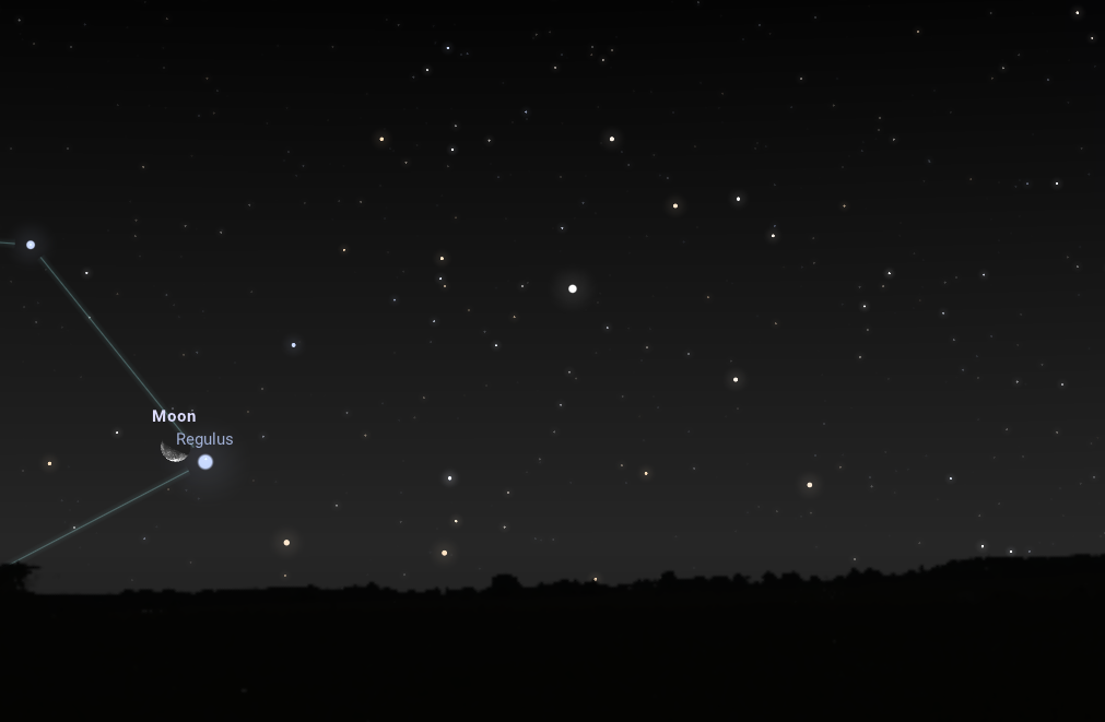 A Hold és a Regulus együttállása: este 23:39-kor szoros együttállásba kerül a felkelő Hold 42%-os sarlója és az Oroszlán csillagkép legfényesebb csillaga, a Regulus. A csillag 23:39-kor a Hold déli csúcsa alatt 18'-re látszik majd, viszont ekkor a horizonthoz való közelség miatt nehezen megfigyelhető. Kicsit később, 0:32-re 10 fokos magasságba kerülnek ugyan, ekkorra azonban távolságuk 29'-re növekszik.