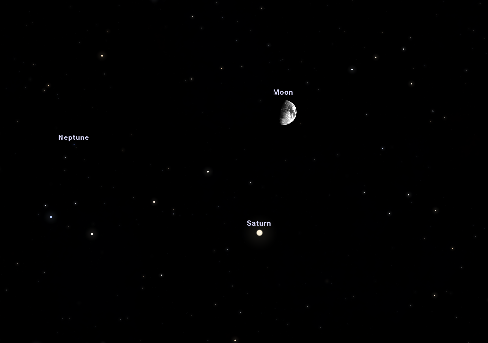 A Hold és a Szaturnusz együttállása: ugyanezen a napon délután 17:30-kor laza, 5,4 fokos együttállásba kerül a 88%-os fázisú Hold és a gyűrűs bolygó. Akinek távcsöve is van, a Holdtól 1,7 fokra megpillanthatja benne a Neptunuszt is a látóhatár felett 23 fokkal.