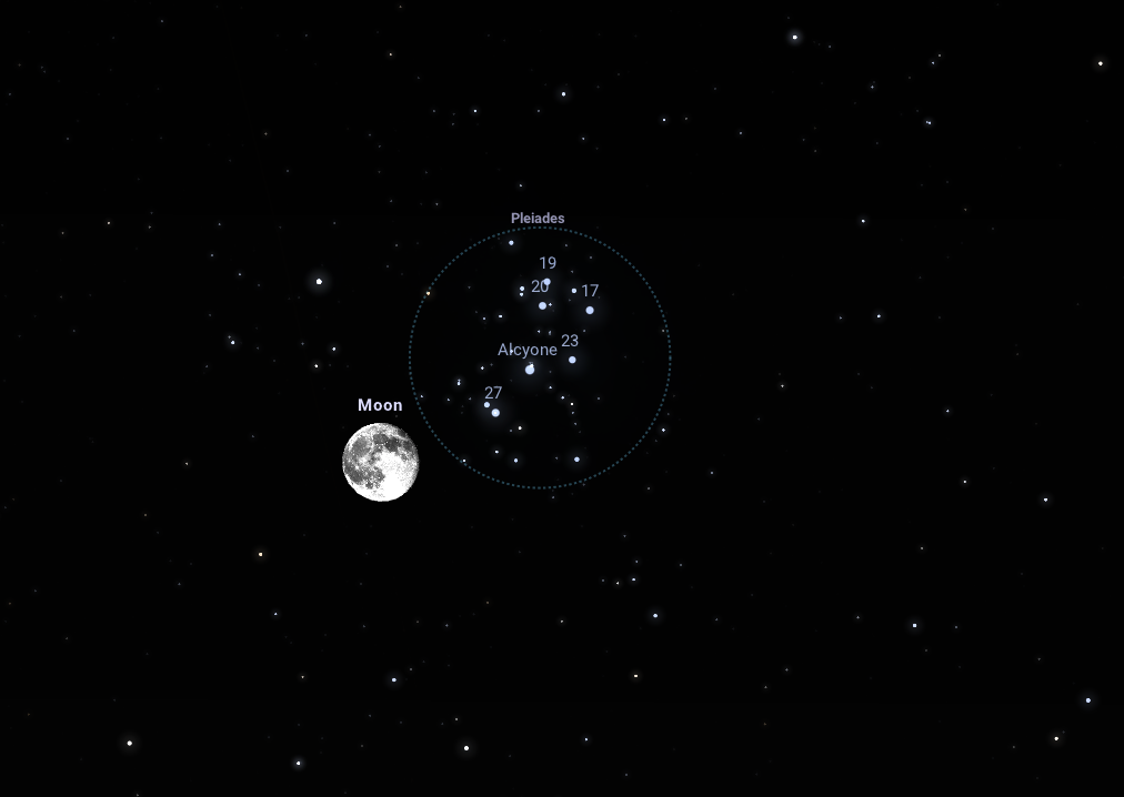 A Hold és a Fiastyúk együttállása: a 98%-os fázisú Hold szoros együttállásba kerül a Bika csillagkép legismertebb nyílthalmazával, a Fiastyúkkal. Este 18:00-kor a Hold a nyílthalmazban található, 3,6 magnitúdós látszó fényességű, Atlas nevű csillag 36'-es távolságba ér egymástól a horizont felett 13 fokkal. Ezelőtt, 17:10-kor lép ki az Atlas a Hold mögül annak sötét oldalán, majd 17:12-kor az 5,1 magnitúdós látszó fényességű Pleione tesz ugyanígy, ekkor még a szürkületi égen, 5,5 fokkal a látóhatár felett. A Hold erőteljes fénye miatt az együttállás megtekintéséhez mindenképpen javasoljuk a binokulár használatát, a szürkületi csillagkilépések megfigyelése pedig távcsövet igényel.