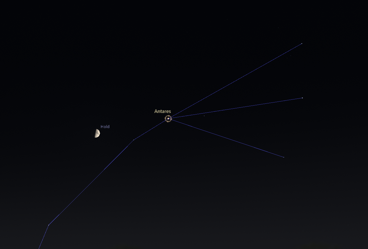 Amennyiben pedig egy nappal később fordítjuk tekintetünket az ég felé, akkor sem kell eltávolodnunk a Skorpió csillagképtől. Ugyanis augusztus 31-én a korábban már sokszor említett Antares csillagot figyelhetjük majd meg az egyre növekvő, ekkor már 55%-os félhold mellett, attól jobbra, kicsit fentebb. Ezen az estén 20:30-kor egymástól 3,9°-ra látszik majd a vöröses Antares és az ezüstös Hold párosa a horizont felett 11°-kal.