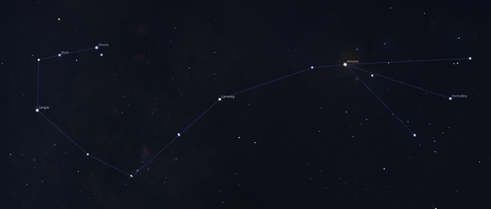 A Skorpió csillagkép egyik érdekes tagja a pí Scorpii (π Sco), amely első ránézésre talán nem tűnik különösebben feltűnőnek, mégis izgalmas égi jelenséget rejt. Valójában nem egyetlen csillagról van szó, hanem egy három tagú csillagrendszerről, amely mintegy 340 fényévre található a Földtől. A pí Scorpii a Skorpió „fejrészéhez” tartozik, és jó látási viszonyok mellett szabad szemmel is megfigyelhető a nyári égen. Bár nem ragyog olyan vörösen, mint az Antares, fontos része annak a jellegzetes csillagképi mintázatnak, amely már az ókori kultúrák képzeletét is megragadta. A rendszer legfényesebb tagjai (pí Sco Aa és Ab) fiatal, rendkívül forró óriáscsillagok, amelyek kékesfehér együttes fényükkel tűnik ki az égen, és mérete, valamint fényerejük messze meghaladja a Napét. A pí Scorpii főtagjai szoros gravitációs kapcsolatban állnak egymással, fedési kettőscsillagot alkotnak, a harmadik tag (pí Sco C) pedig a belső két csillag körül kering, így a rendszer dinamikája különösen izgalmas a csillagászok számára.