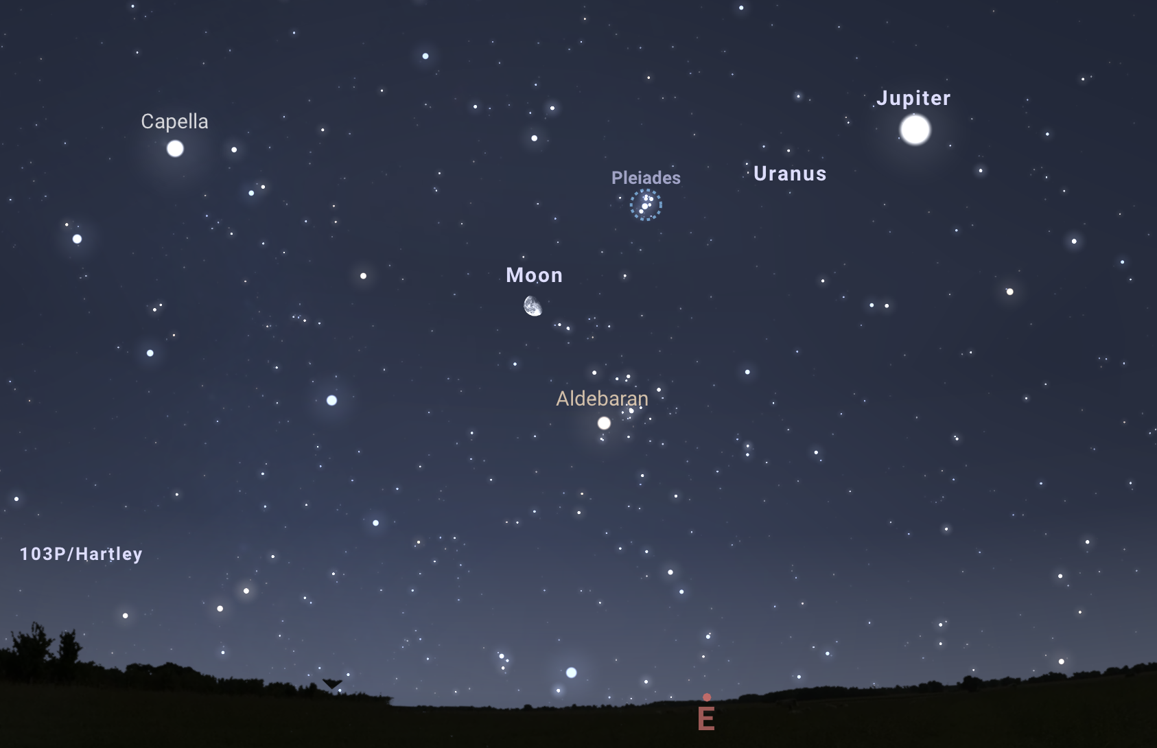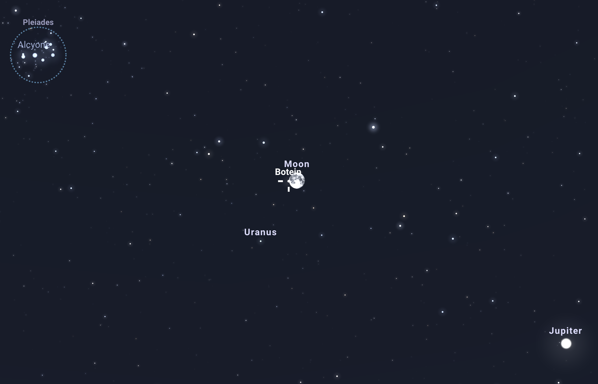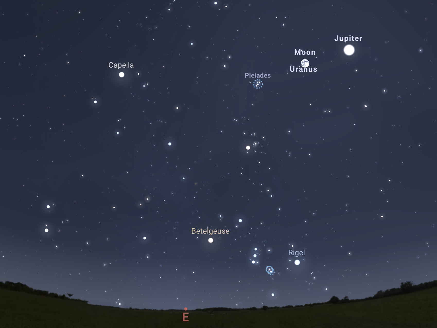 Ezeken az éjszakákon már a keleti égre az esti órákban felmerészkedő Jupiter – Uránusz – M45 nyílthalmaz (azaz Fiastyúk) trió is említést érdemel, a három objektum ugyanis egy vonalban, egymástól körülbelül hat fokos távolságban helyezkedik majd el.