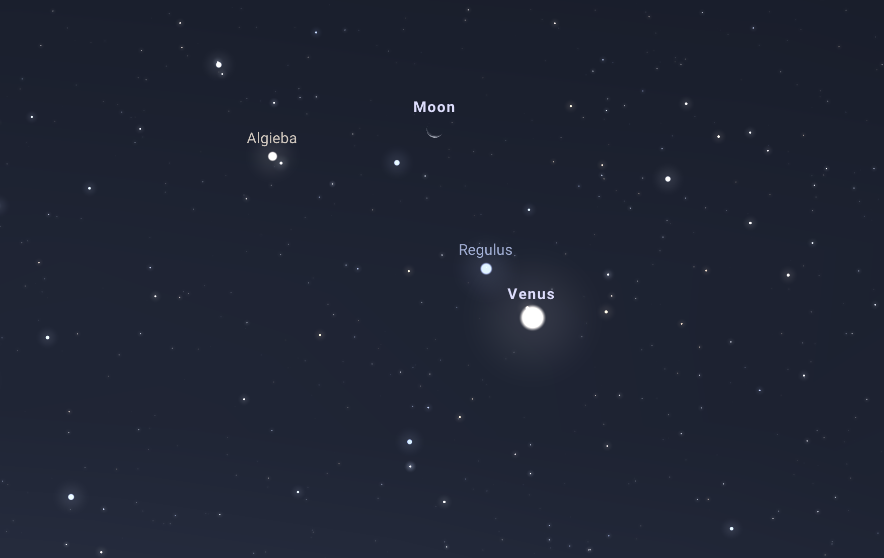 Ezúttal a Vénusz az „áldozat”: október 10-én hajnalban, 05:30-kor mindössze két és fél fokra lesz egymástól a -4,4 magnitúdóval ragyogó Esthajnalcsillag és az 1,4 magnitúdós kékesfehér Regulus. A látványt kiegészíti majd a párosnál körülbelül öt fokkal feljebb az égbolton „függő”, 11%-os holdsarló.