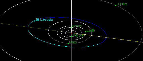 Október 7-én, hétfőn a (39) Laetitia oppozícióját tudjuk megfigyelni. A kisbolygót először 1856. február 9-én figyelte meg Jean Chacornac francia csillagász, és a vidámság római istenéről nevezte el. A Laetitia egy S-típusú aszteroida, ami azt jelenti, hogy elsősorban szilikátok építik fel. Keringési periódusa 4,6 év, saját tengelye körül pedig 5 óra alatt fordul meg. Keringésének napközeli pontja 2,46 CSE-re található, míg a Naptól legnagyobb távolsága 3,08 CSE, a Földtől vett legkisebb távolsága pedig 1,46 CSE. A test átmérője 179,5 kilométer, ami az itt keringő aszteroidák 99%-nál nagyobb méret. Az oppozíció idején a Cet csillagképben találjuk meg a 9,1 magnitúdós fényességű kisbolygót, nem messze a 25 Ceti csillagtól.