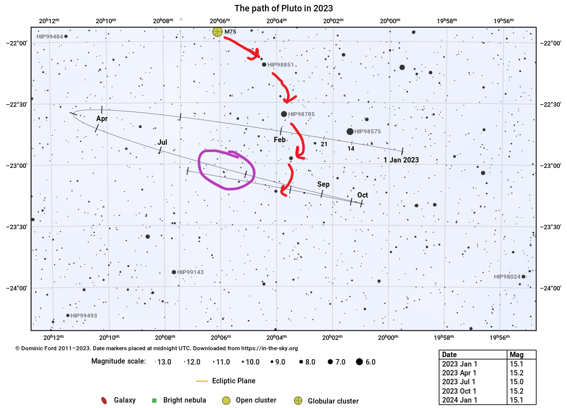 Miután megtaláltuk és megcsodáltuk az M75-öt, azután a fényes HIP 98851 csillagot keressük meg, majd haladjunk lépésről lépésre a piros nyilak által jelzett úton. Az utolsó csillaghoz érve jön a legnehezebb szakasz, mert a léptékeket segítségül hívva kell megtalálnunk a lila régiót. Itt egy elképesztően halvány pöttyöt keresünk: egy csillagot, ami a fekete vonallal jelzett pályán van, de a térképen nincs jelölve. Ez a nem jelölt csillag lesz maga a Pluto.